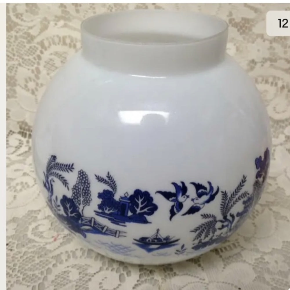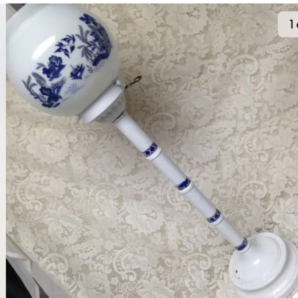 This is a beautiful electric table or floor lamp with a milk glass globe and the stand is made of painted metal. Both are decorated with the popular blue willow pattern. It measures about 33 inches high and the globe measures 7.5 inches high and 7.5 inches in diameter. The stand without the globe measures about 24 inches tall. The lamp is in good vintage condition with minimal wear or roughness on the stand but was repainted as shown in photos. The blue willow design has been added or custom made by a blue willow enthusiast. Package weight is about 7 lbs. The item will be shipped in 2 packages. There will be extra shipping charges due to size and weight.