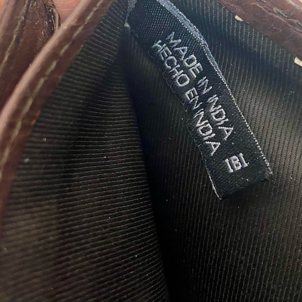 This is a pre-owned mens wallet made of brown leather. It measures 4.5 inches long and 3.5 inches wide. It is in good condition with minimal wear as shown in photos. Please supersize for condition details..