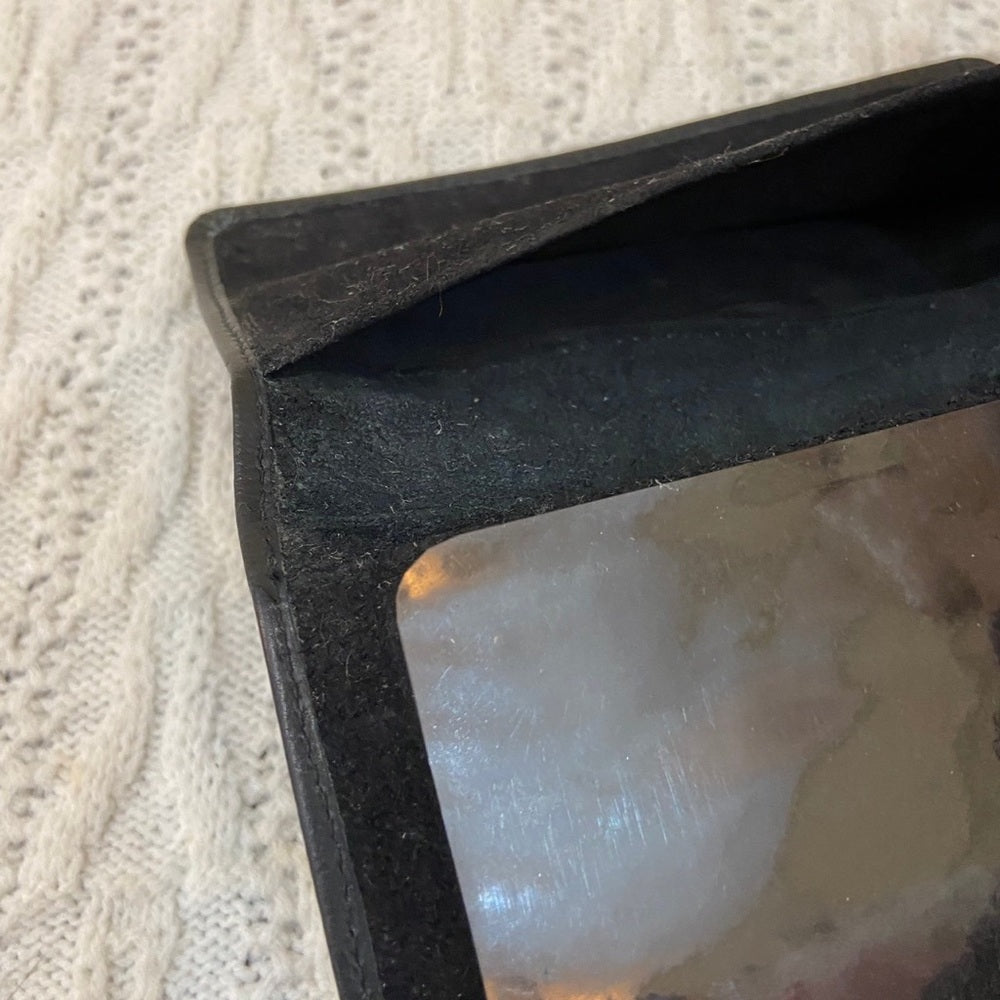 This is a pre-owned black, genuine leather Checkbook case with exterior ID window. It measures 7 inches long and 4.5 inches wide. It is in good condition with normal wear as shown in photos. Please supersize for condition details..