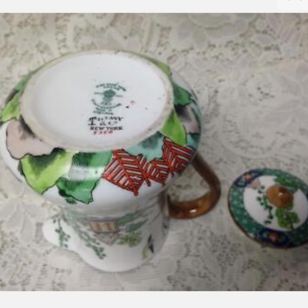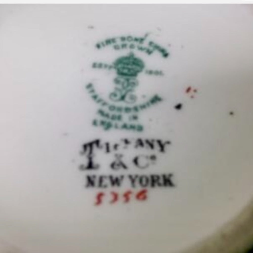 It is marked: Fine Bone China, Crown Staffordshire, Est. 1801, England. The teapot has additional marking of Tiffany & Co., New York. It is in very good vintage condition, no chips or cracks as shown in photos. Package weight is about 4 to 5 pounds.