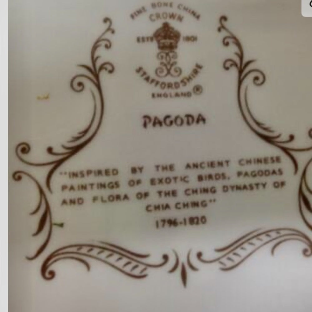 The set is in very good vintage condition with minimal wear as shown in photos. It is marked: Fine Bone China, Crown Staffordshire, Pagoda , Inspired by the Ancient Chinese Paintings of exotic Birds, pagodas and flora of the Ching Dynasty:1796-1820. Package weight is about 5 pounds. I have matching Dinner Plates so If you are interested please check out my other listings.