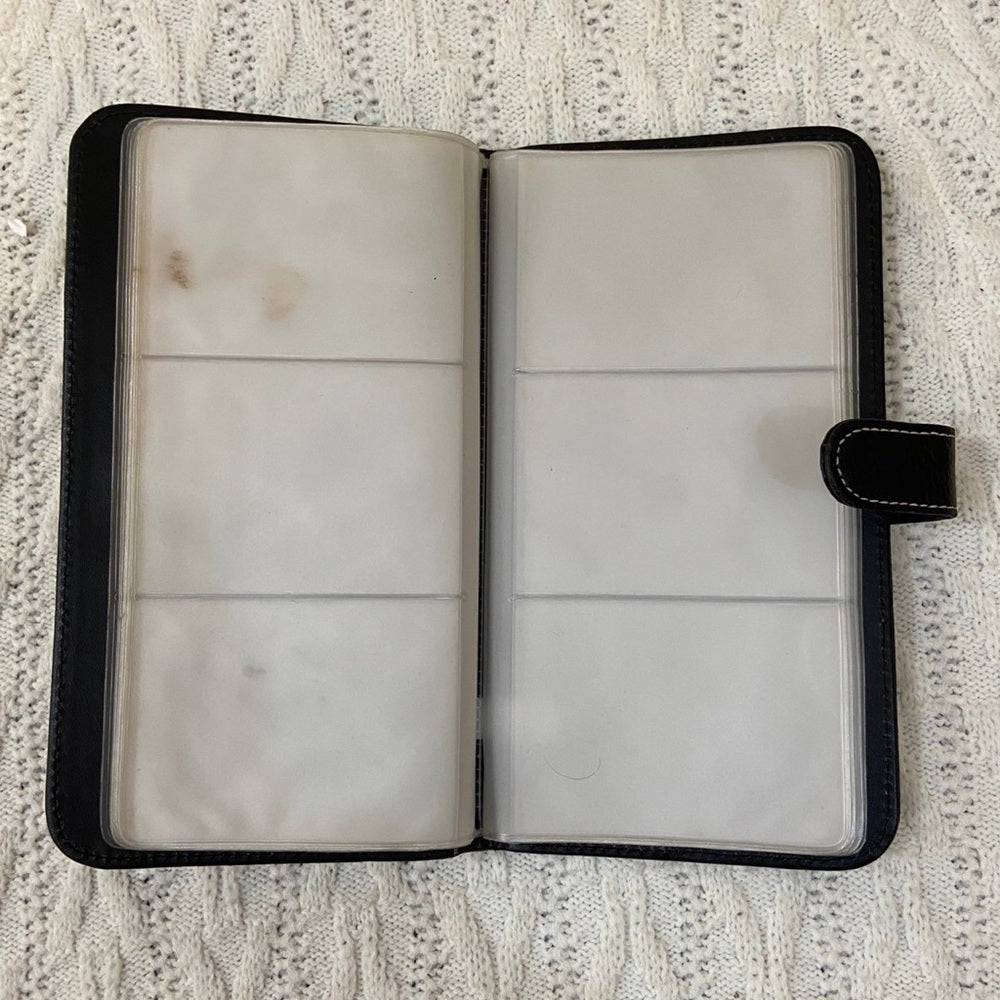 This is a pre-owned, black genuine leather business card organizer that can accommodate 72 inches business cards. It measures 9 inches long and 5 inches wide. It is in good condition with minimal wear as shown in photos. Please supersize for condition details..