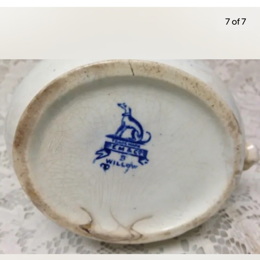 This is a beautiful Blue Willow Milk Jug or pitcher and it measures 6.5 inches tall and 6 inches wide. It has normal age wear such as crazing and staining as shown in photos. The pitcher is marked: E. M. Co., Willow; known to be Edge Malkin, Enlgand. The 2 tumblers were added to the pitcher as a set.