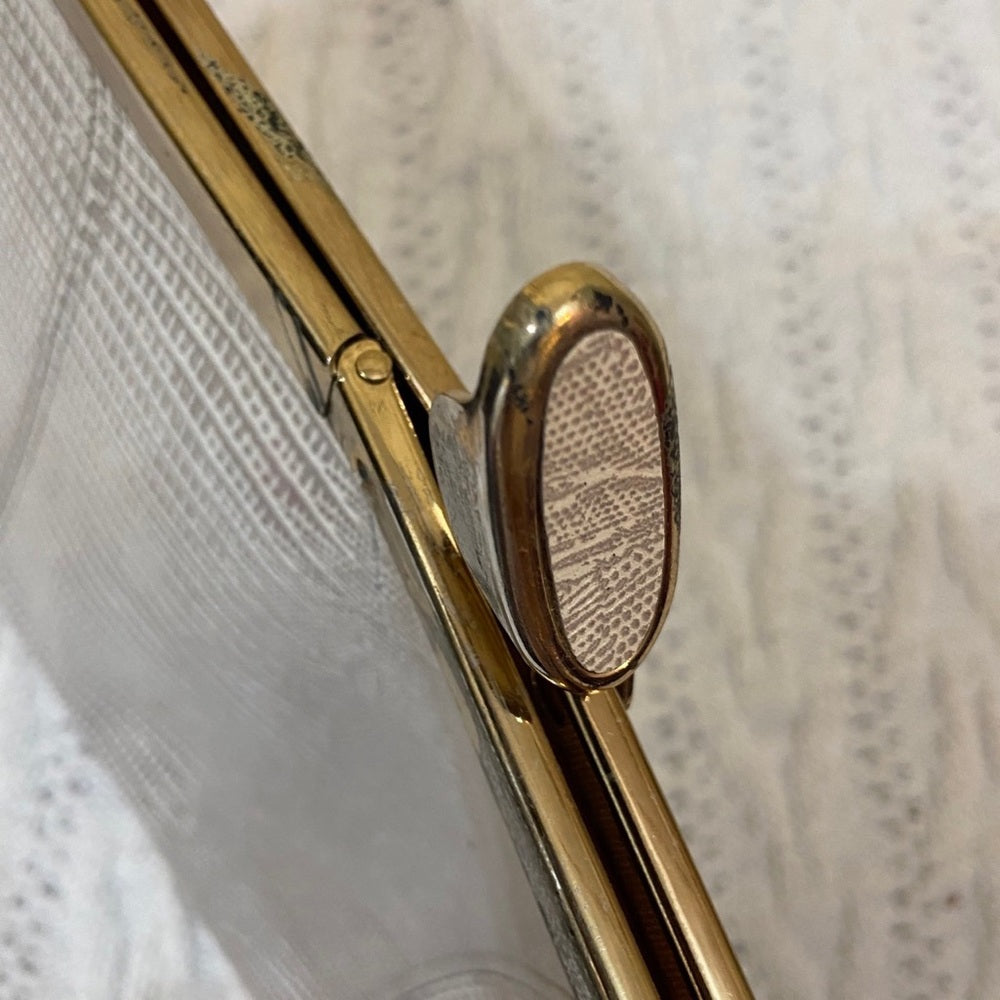 This is a pre-owned elegant grayish beige clutch with shoulder strap, made of embossed lizard leather. It measures 11.5 inches long and 6.5 inches wide and comes with a 30-inch chain shoulder strap. The clasp and chain is tarnished and needs polishing. Overall, it is in good condition with minimal wear as shown in photos. Please supersize for condition details. It is marked: Etra, Genuine Leather.