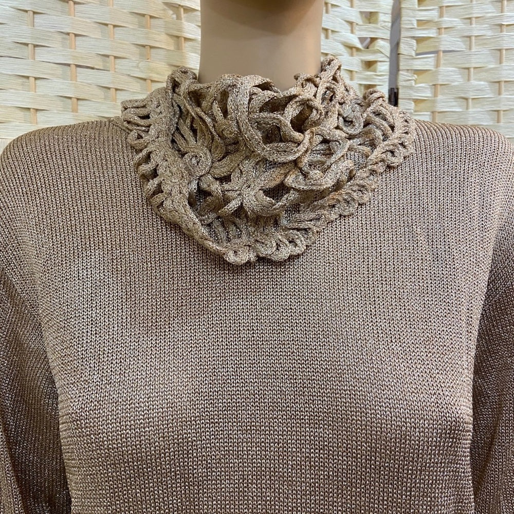 This is a beautiful, gold formal evening tunic or mini dress made by Exclusively Misook. It is in good condition with minimal wear as shown in photos, and will fit a Size:M-L, actual measurements to follow: