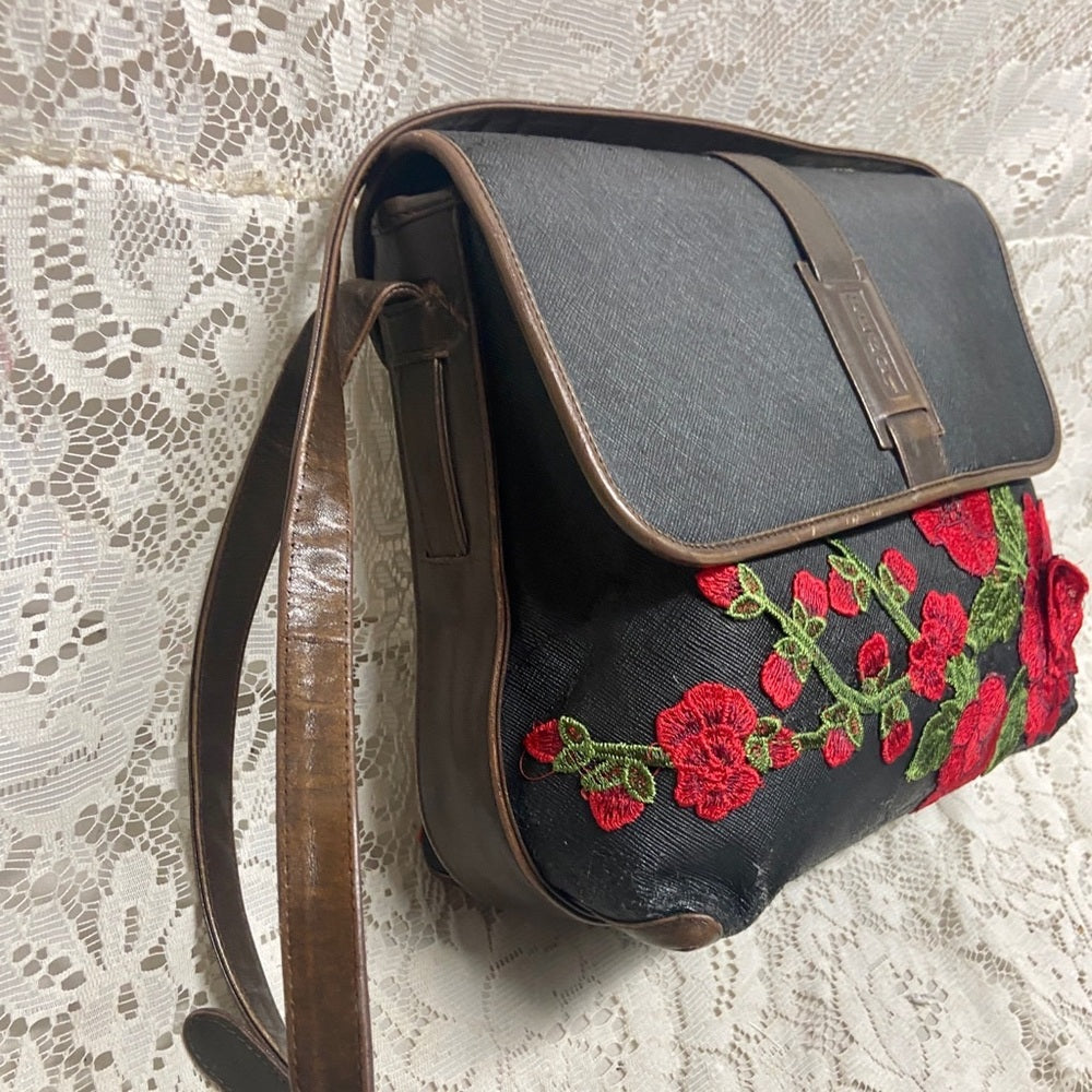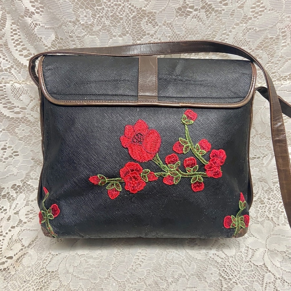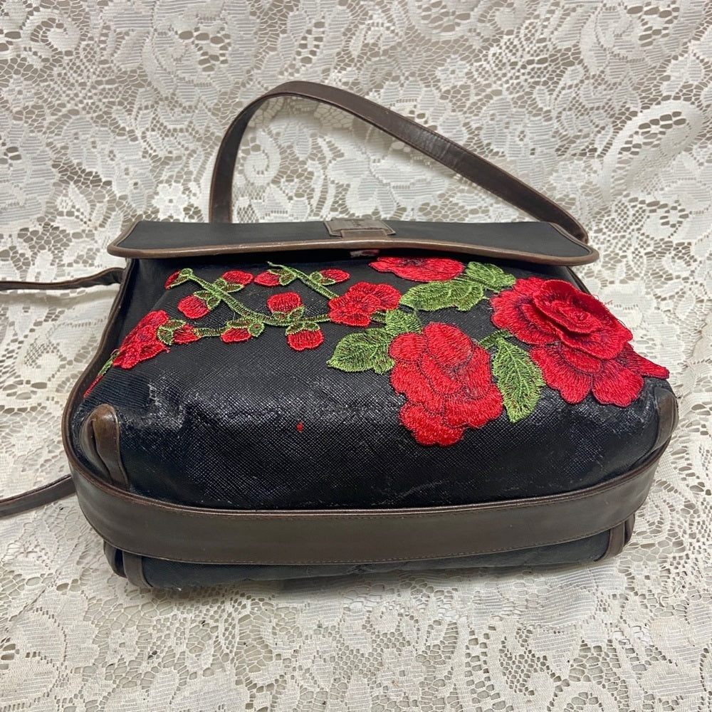 This is a pre-owned Fendi handbag made of black coated canvas with brown leather trim and 17in brown leather strap. It measures 10 inches long, 9 inches high and 4.5 inches wide. The floral decoration is not original and was handcrafted by the original owner. It has some wear and creases at the bottom area and corners as shown in photos. Please super size photos for condition details.