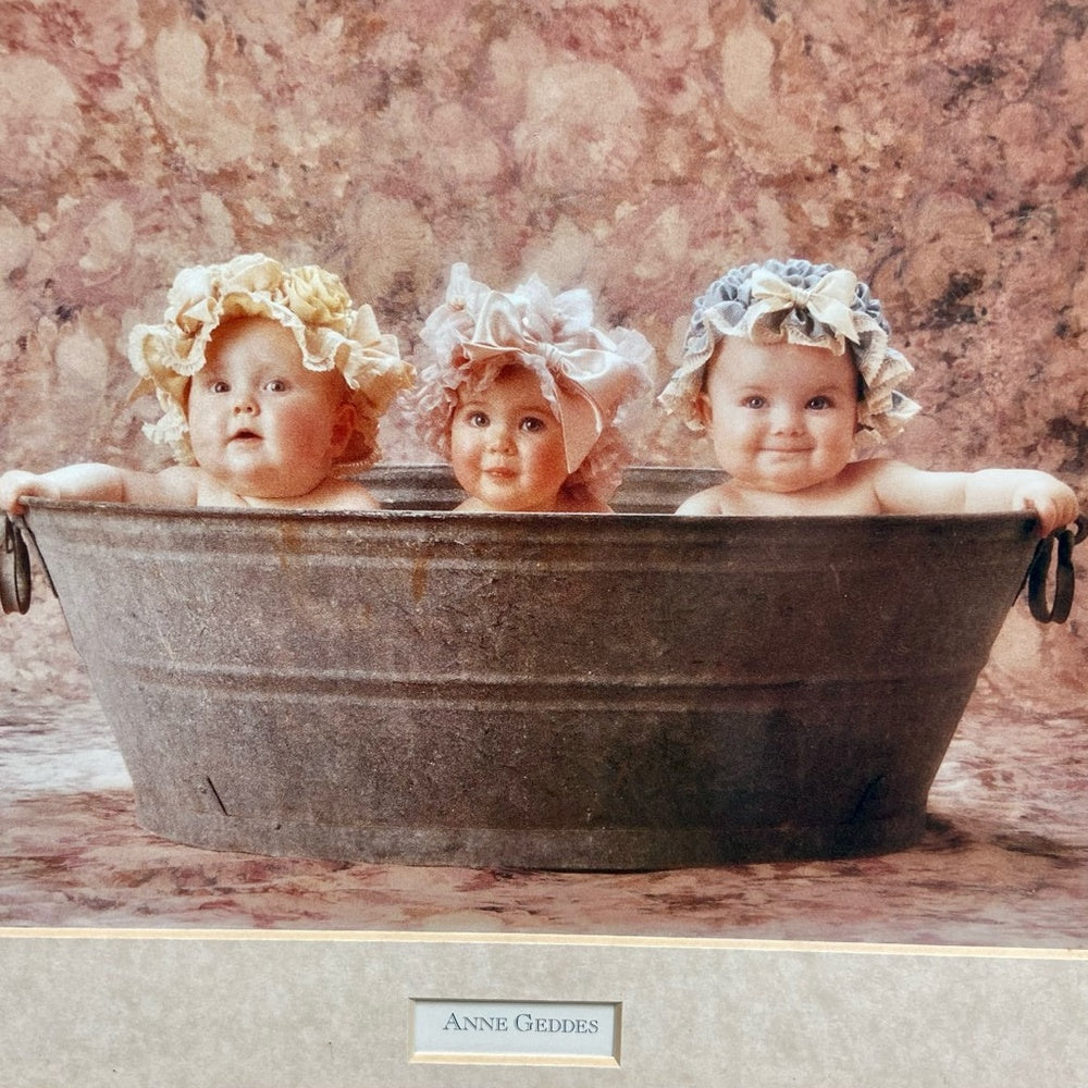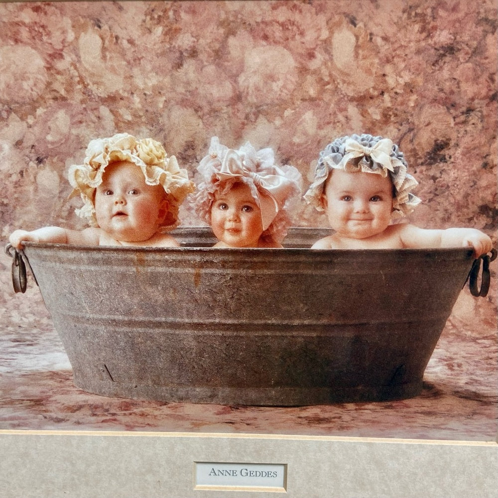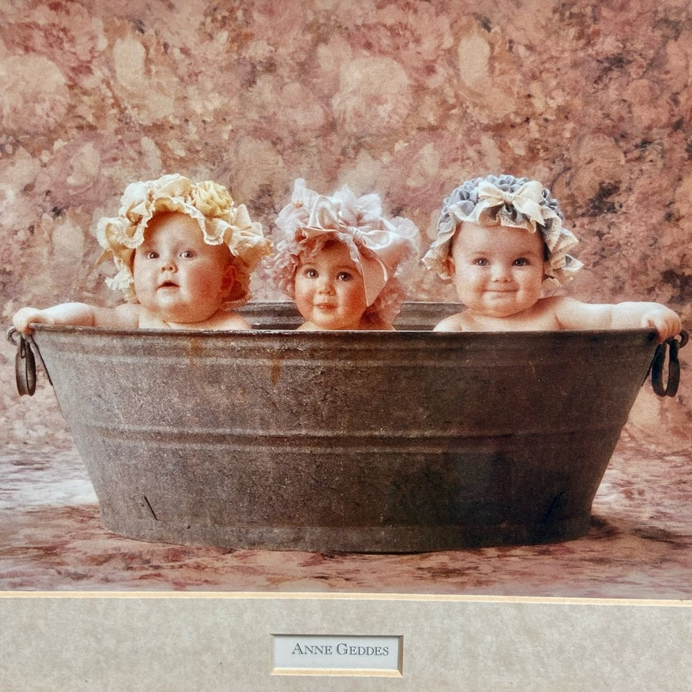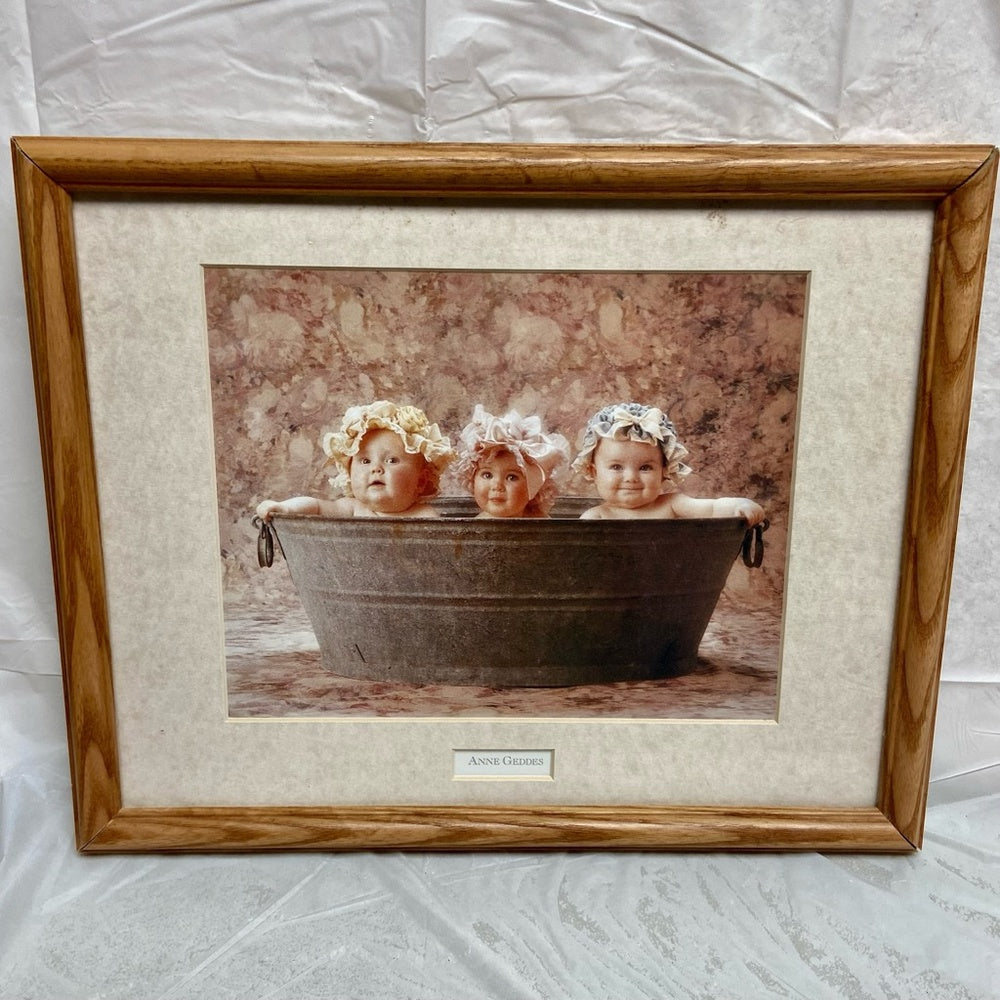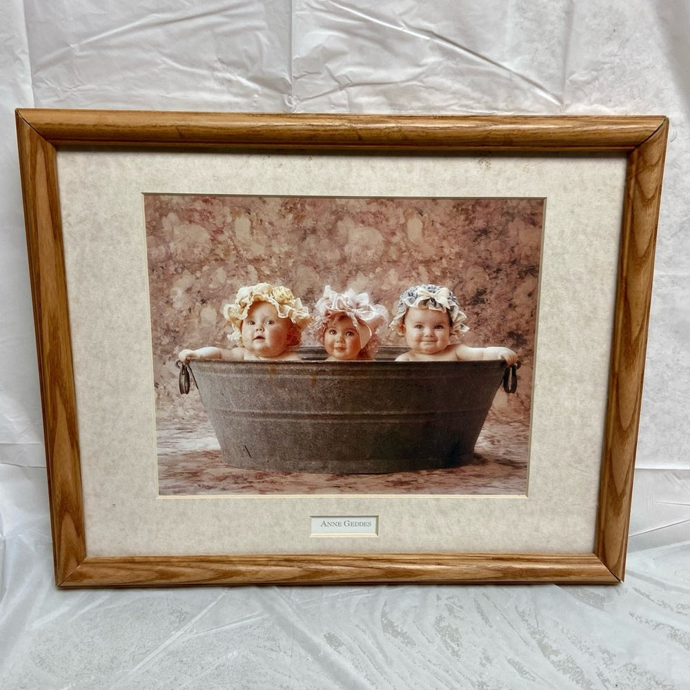This is beautiful framed artwork, depicting 3 adorable infants in an antique glavanized tub. Framed this lovely print measures 15.5 inches long and 12.5 inches wide. It is in very good condition with minimal wear as shown in photos. The print is marked Anne Geddes. Package weight is about 5 pounds.