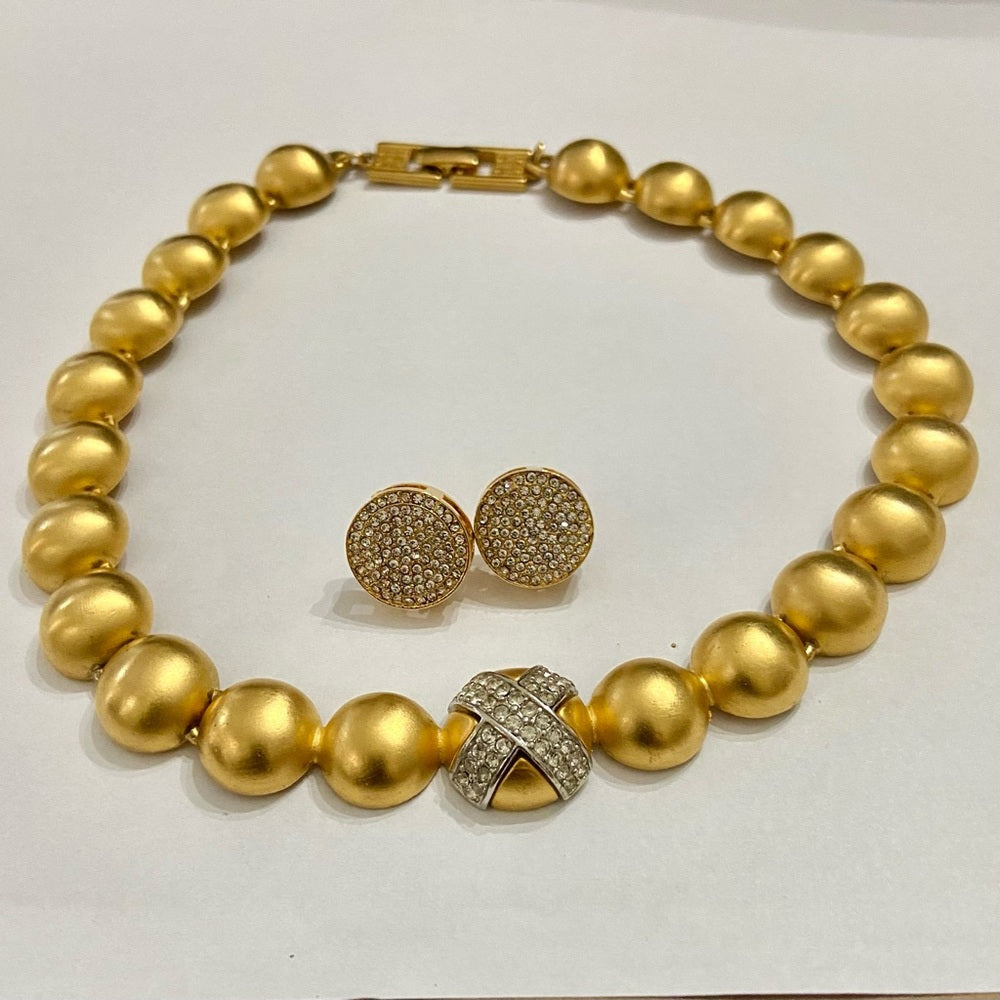 This is a vintage Givenchy, Paris- New York, gold tone, chunky balls with tiny crystal in X shaped centerpiece necklace. It comes with a screw back pierced paved crystal earrings, no markings visible. It is in very good condition as shown in photos. Please supersize for condition details.