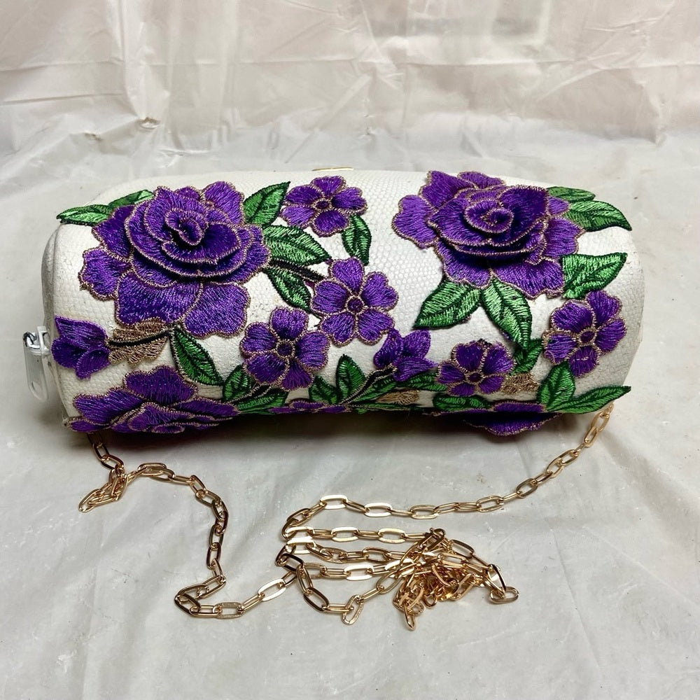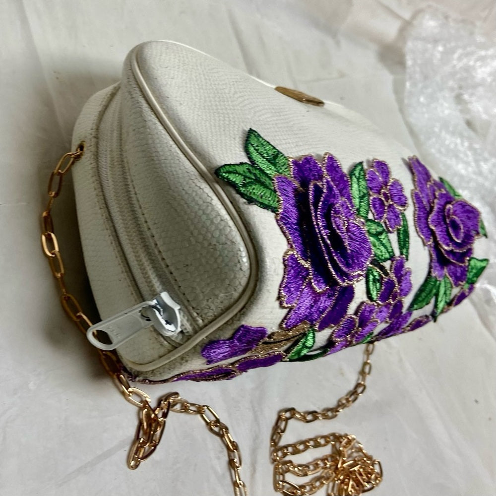 This is a rare, vintage, pre-owned, small white carry-on pouch with added 46-inch crossbody gold chain strap. It measures 8.5 inches long, 5 inches high and about 3 inches wide. The exterior of this pouch has roughness and some areas were covered with purple floral embellishments. The original leather crossbody strap was replaced with gold crossbody chain. Overall it is in good condition as shown in photos. Please supersize photos for condition details.