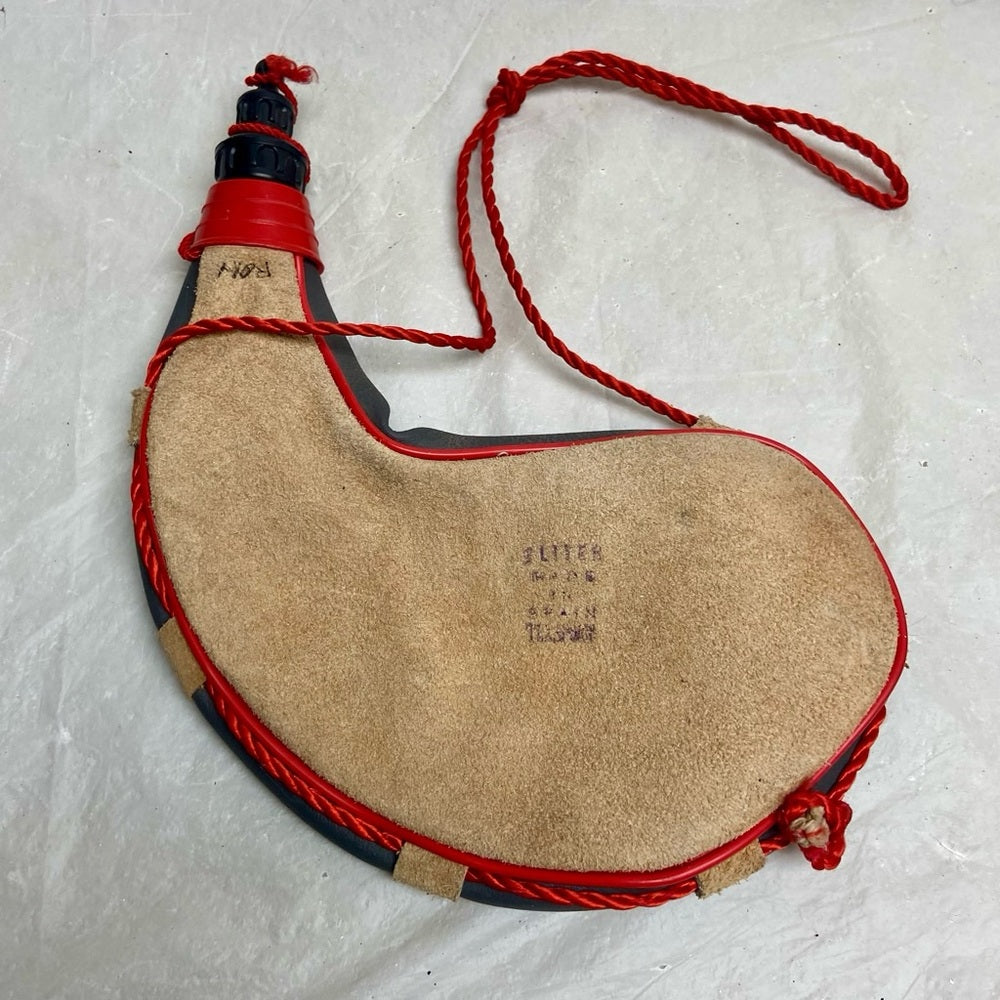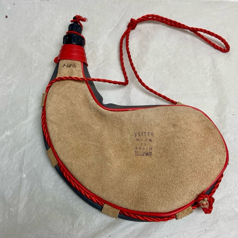 This is a beautiful water Jug made of Leather with one liter capacity and comes with 30-32-inches shoulder strap. It measures 8 inches long and 8 inches wide. It is in good condition with minimal wear as shown in photos. Please supersize photos for more detailed conditions.