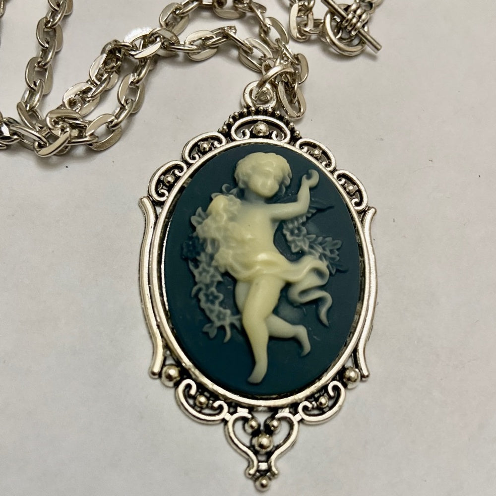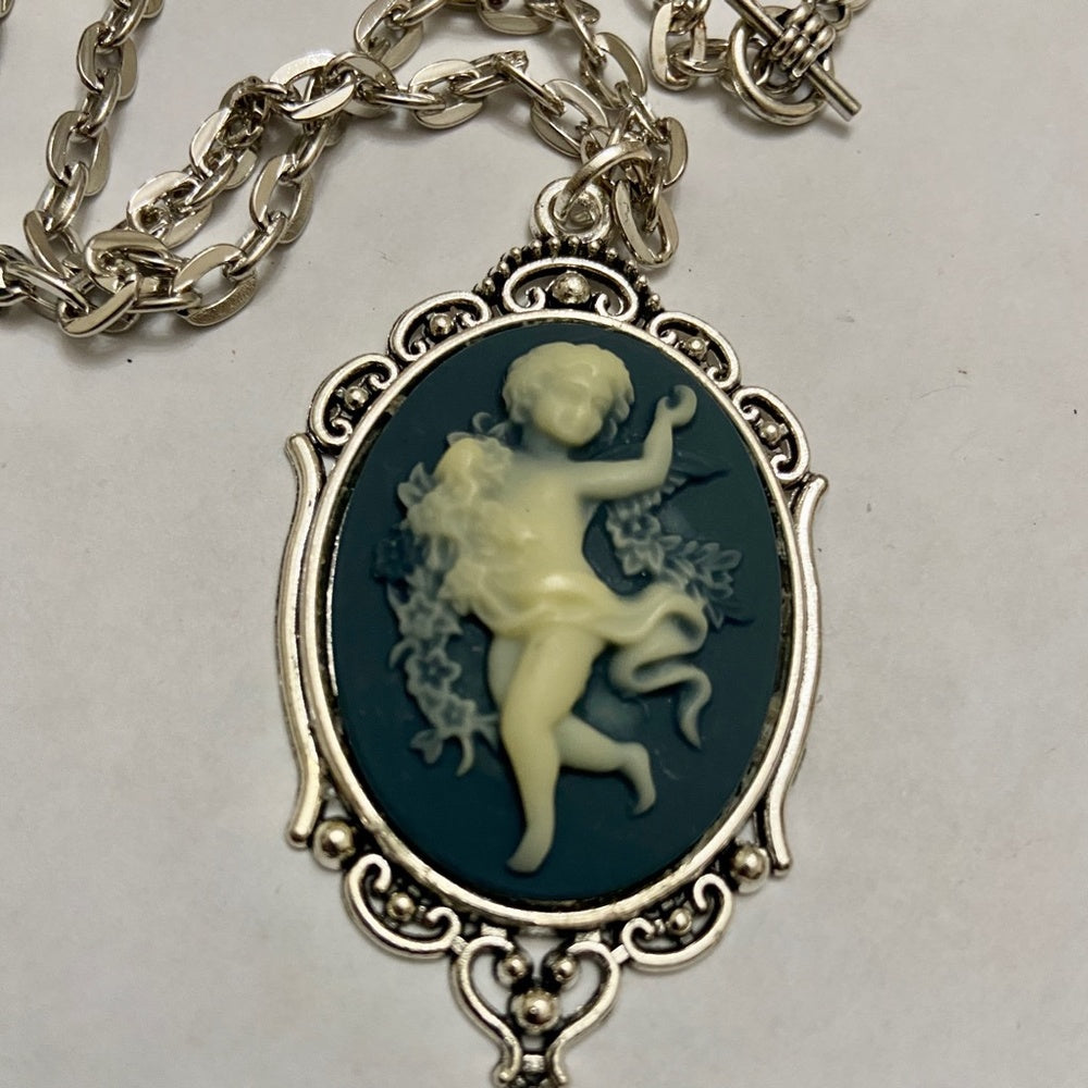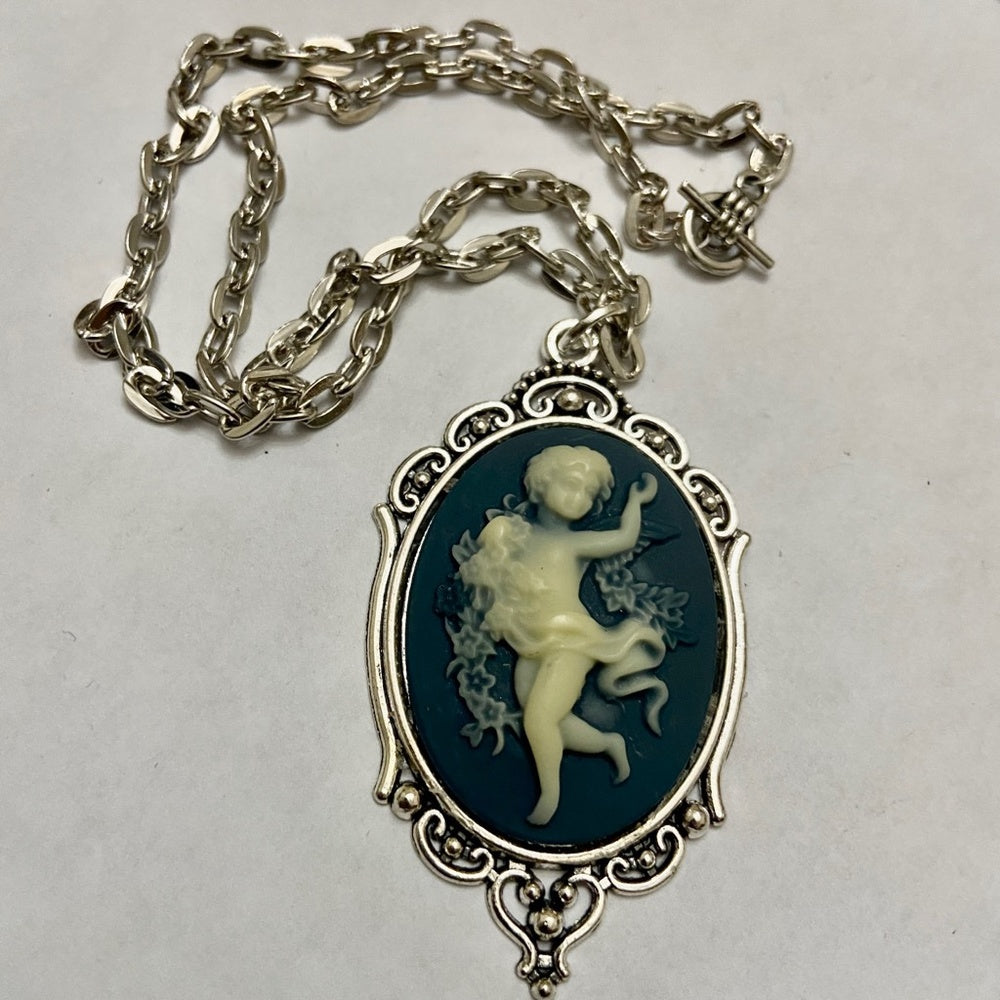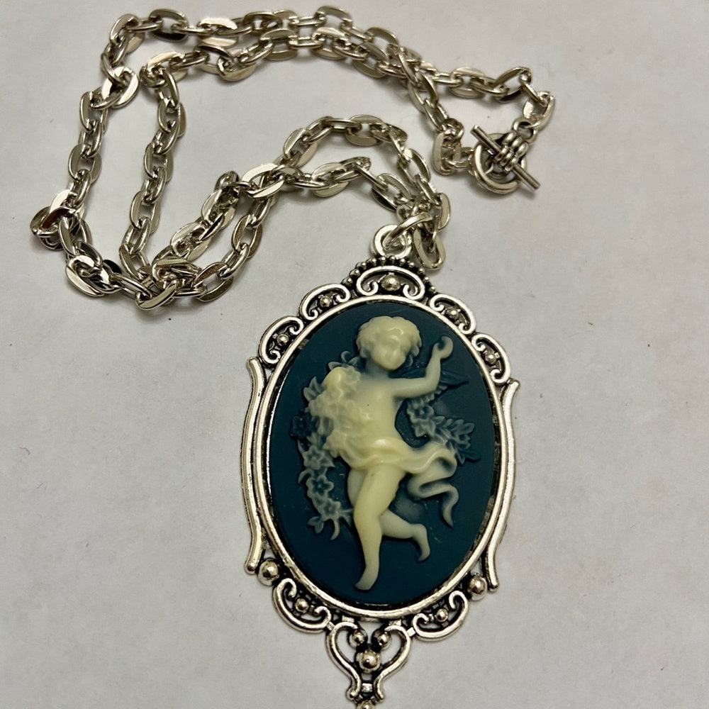 This is a beautiful pendant necklace depicting a cameo of a Cherub over a grayish black background. The cameo measures 2.5 inches long and 1.5 inches wide. It comes with an 18-inch silver plated chain necklace. It is in very good condition as shown in photos. Please super size photos for condition details.