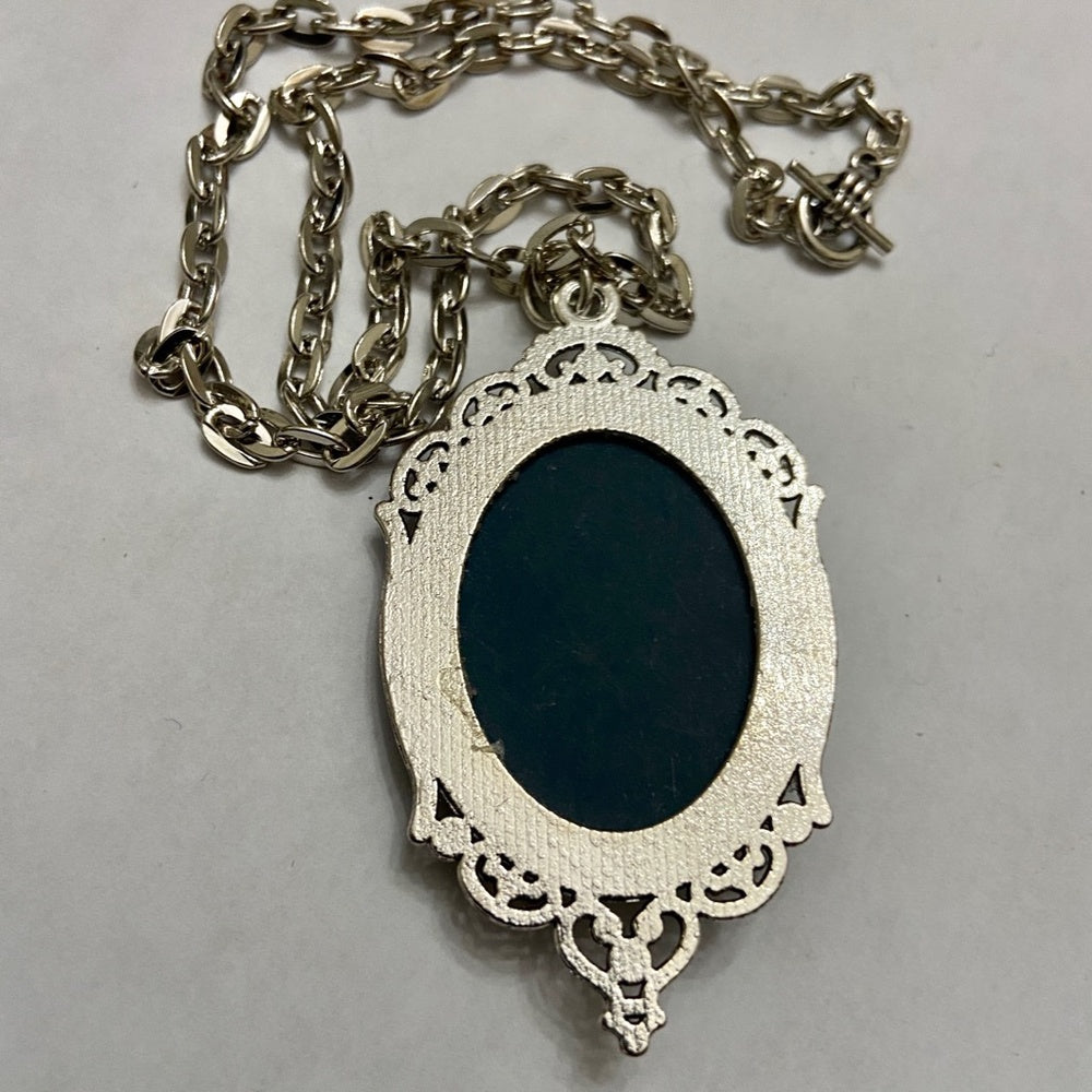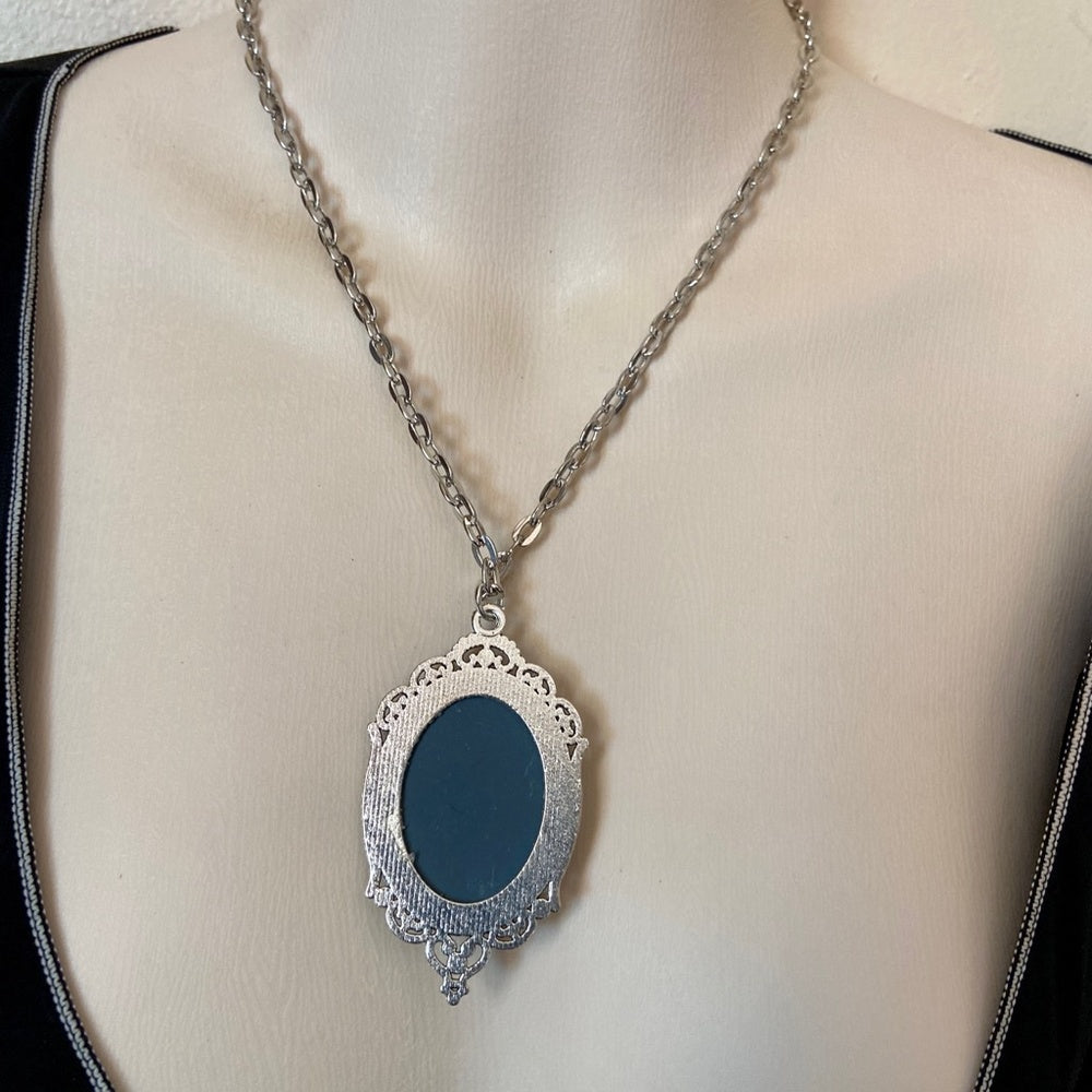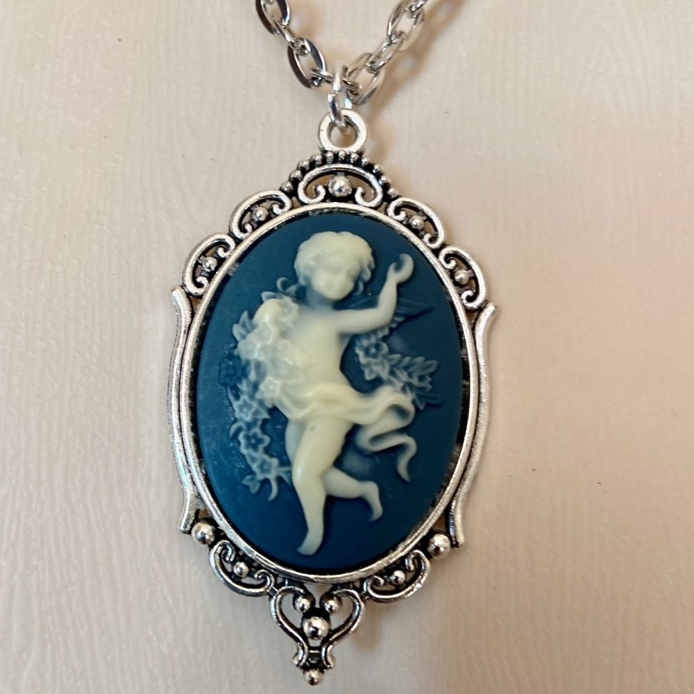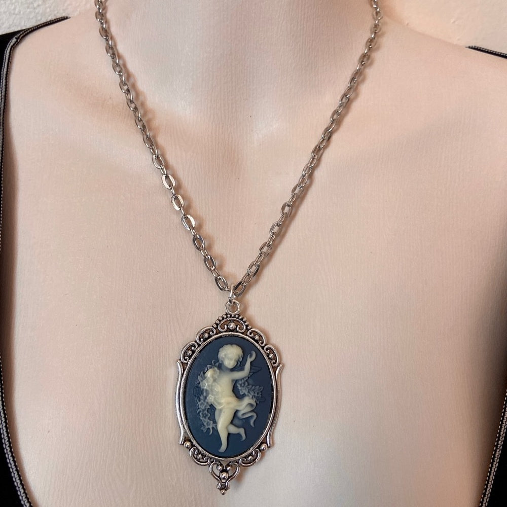 This is a beautiful pendant necklace depicting a cameo of a Cherub over a grayish black background. The cameo measures 2.5 inches long and 1.5 inches wide. It comes with an 18-inch silver plated chain necklace. It is in very good condition as shown in photos. Please super size photos for condition details.
