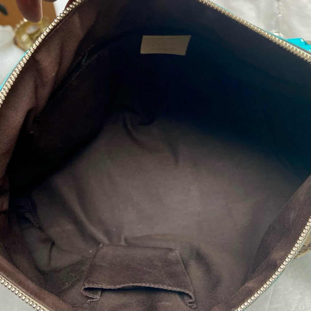 Vintage Gucci, Brown Mono w/ Teal Blue Leather Trim Handbag 13in x 9in x 4in
