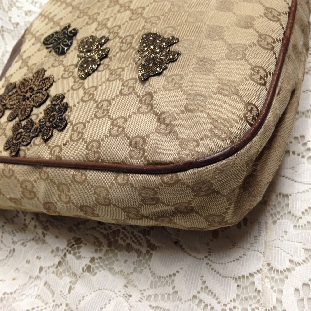 This is a pre-owned Gucci purse- shoulder bag made of brown monogram canvas with brown leather trim and strap. It measures 14 inches long, 13 inches high and 2.5 inches wide. It has minimal fraying on the exterior, some creases and scuffs. The gold floral and butterflies appliqués are not original and was added to cover some fraying and creases as shown in photos. Please supersize photos for condition details.