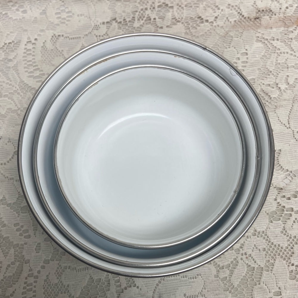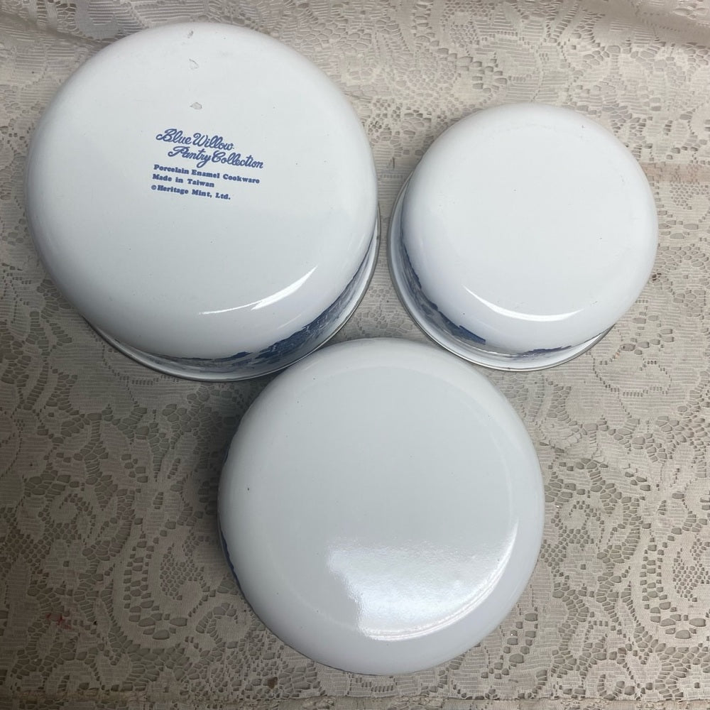 Vintage, Heritage Mint, 3pc Blue Willow Enamelware Mixing Bowls 7.5in, 7in n 6in