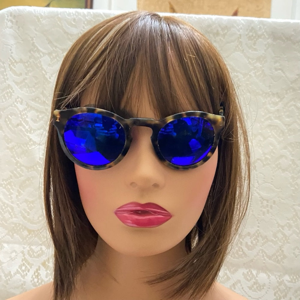 This is a beautiful blue mirrored sunglasses and it has scratches or spots on the blue mirrored exterior as shown in last photo however the interior is in good vintage condition with minimal wear as shown in photos. Both temples are marked: Illesteva Leonard; The front measures 5.5 inches long and each frame measures 2 inches high and 2.5 inches long.