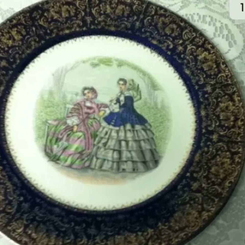 This is a rare, elegant portrait plate depicting 2 beautiful Victorian Ladies with a cobalt blue and gold scrollworks framed around it. It measures 11 inches in diameter and the portrait or image itself is about 7.5 inches in diameter. It is marked: Imperial by Salem China Co., Made in USA, 23 Karat Gold. It is in good vintage condition with minimal wear such scratches on the image area and discoloration on the cobalt blue frame as shown in photos. Package weight is about 3 pounds.
