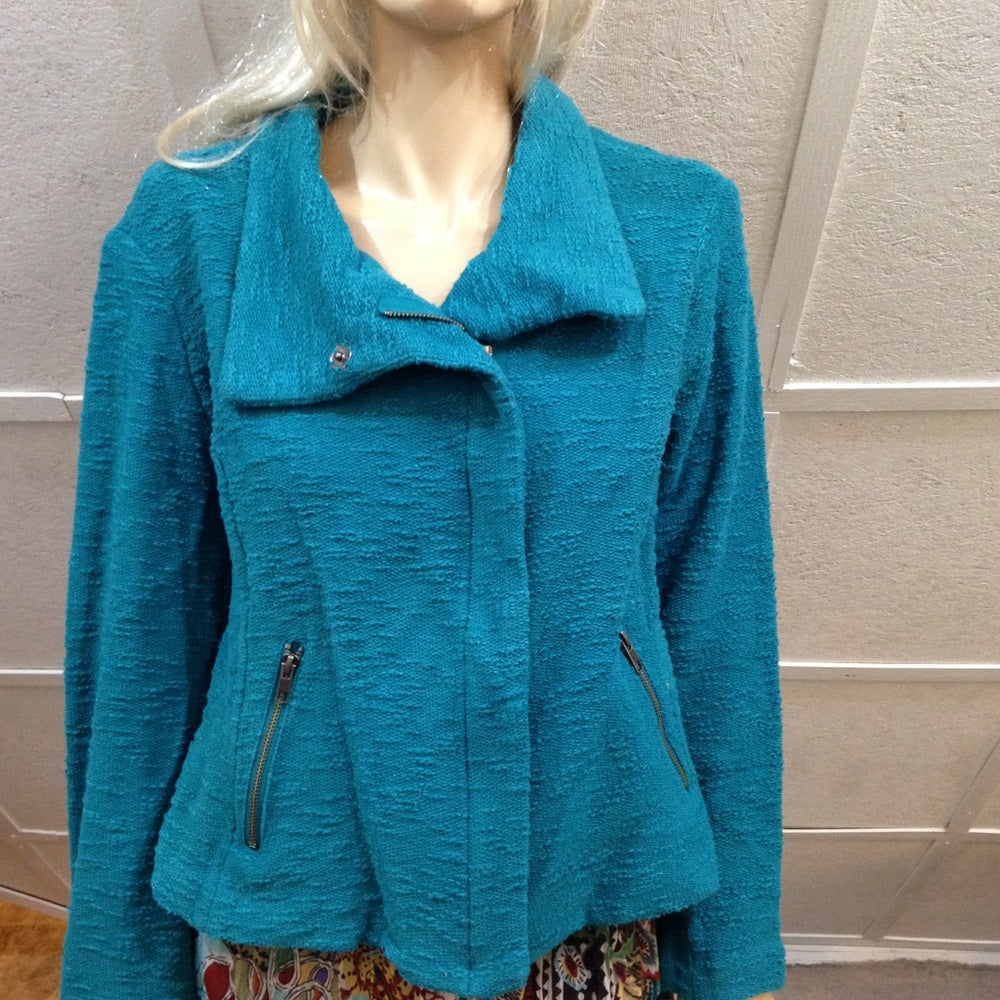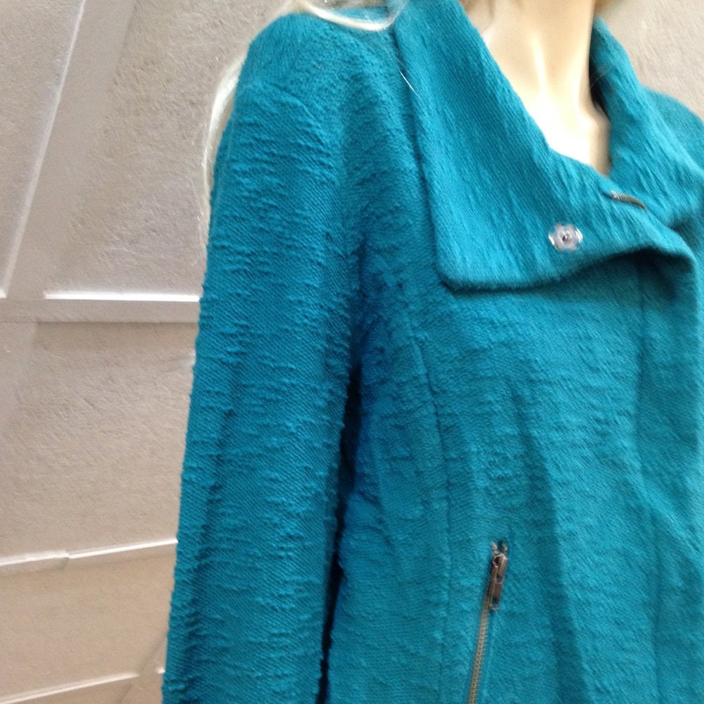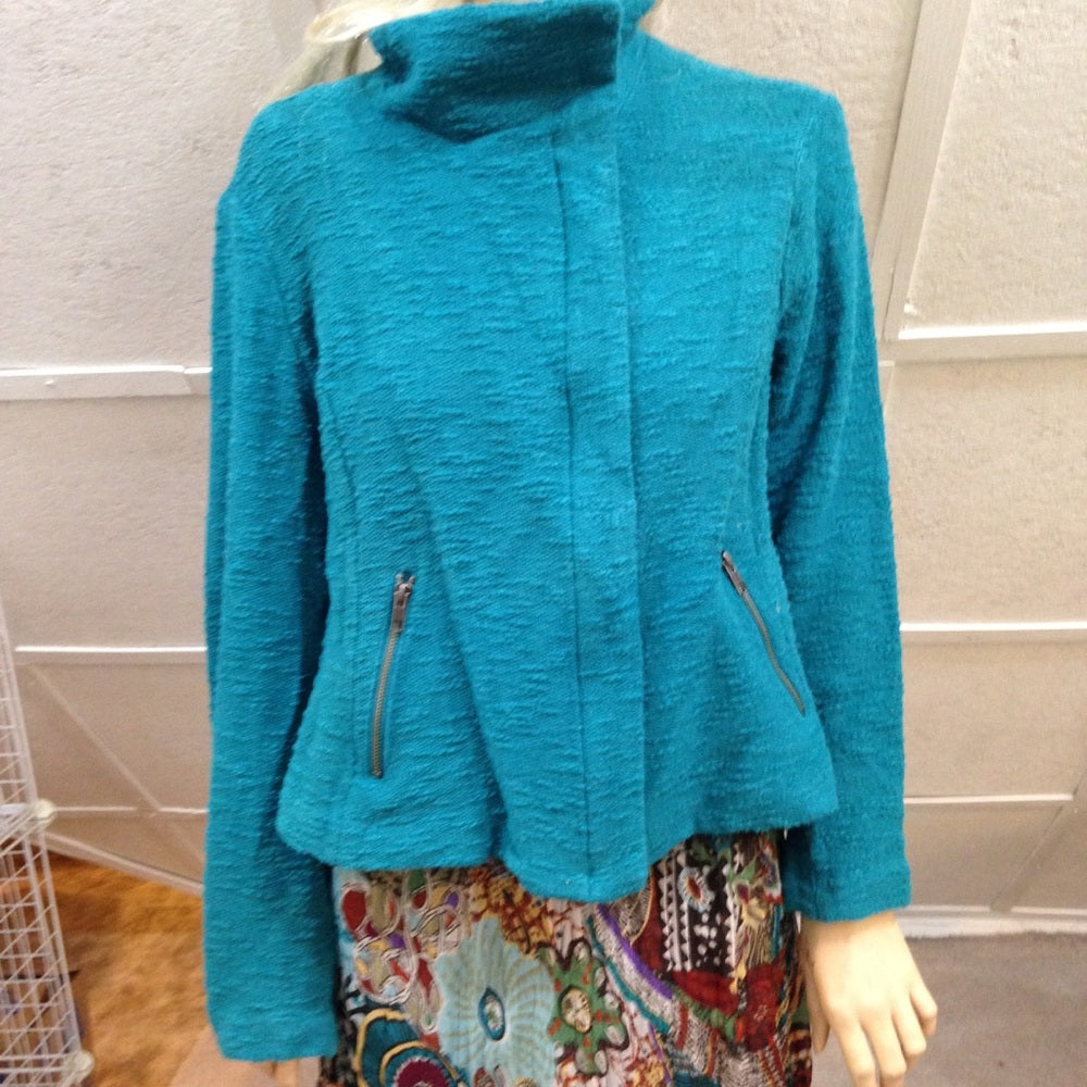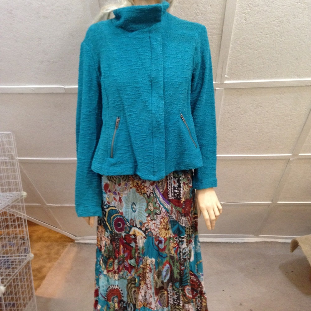 This is a beautiful blazer, made of aqua blue fabric with front zipper and 2 side zip-pockets. It is in good vintage condition with minimal wear as shown in photos. Dry cleaning recommended. The actual measurements follows:
