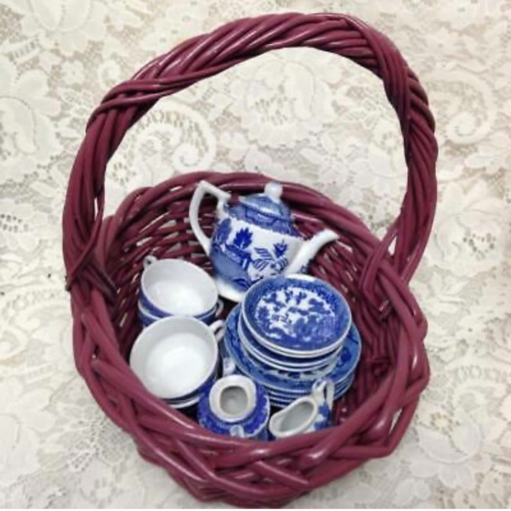 Vintage, Japan, Blue Willow, 17pc Child’s Tea Set - Pink Wicker Picnic Basket