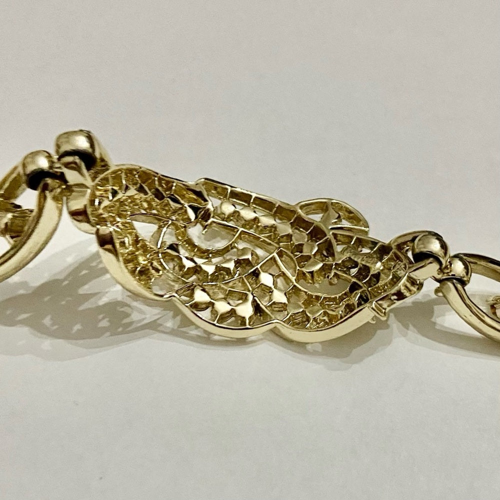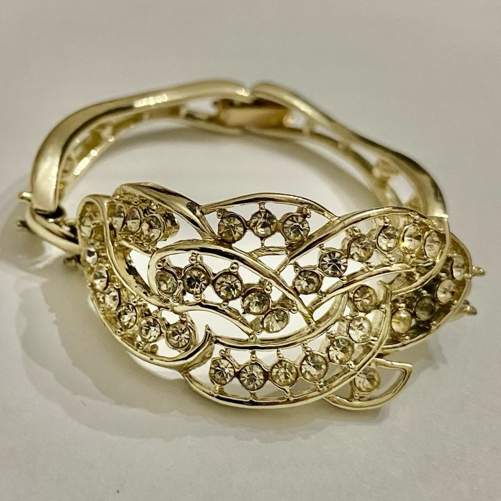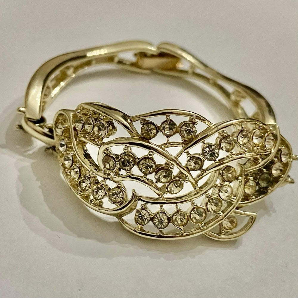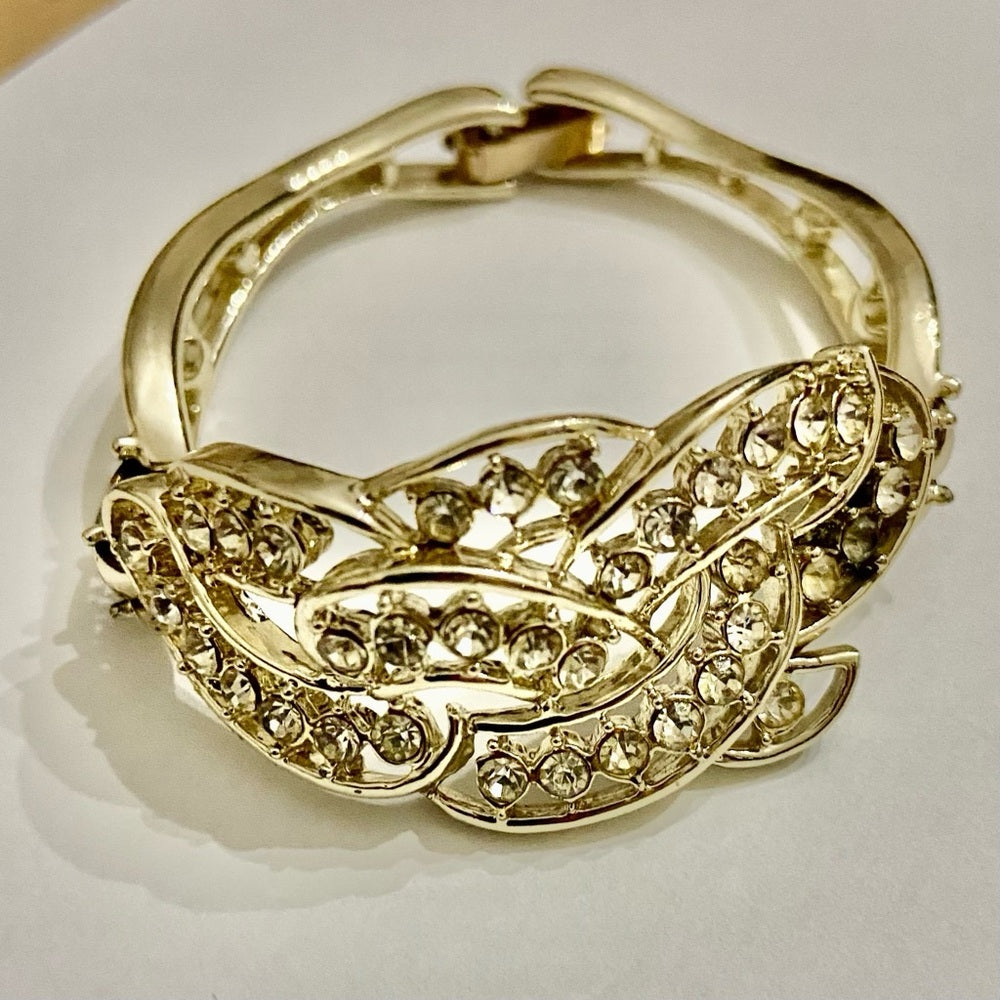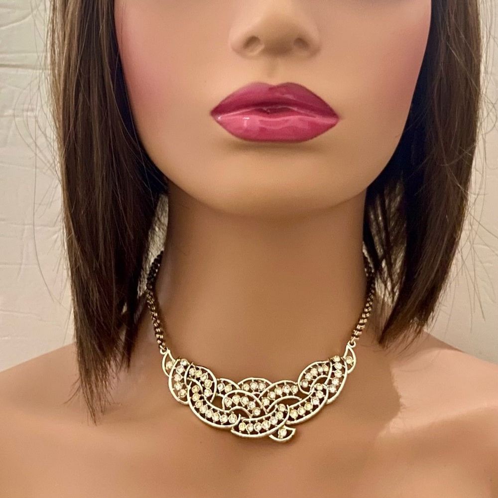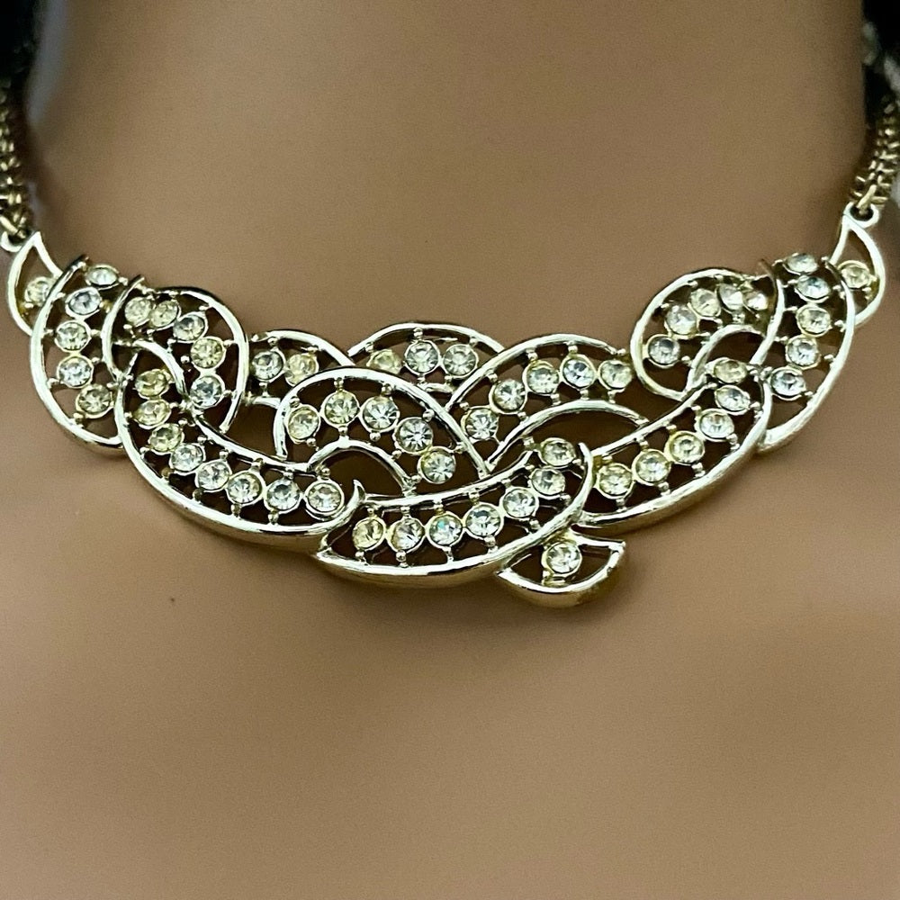 This is a beautiful and stunning gold tone necklace and bracelet set decorated with tiny clear crystals. It is about 16 inches long and the centerpiece paved with tiny crystals is about 3.5 inches long and 2 inch wide it is in very good condition as shown in photos. It is marked: Kramer at the back of both pieces. Please supersize photos for condition details.