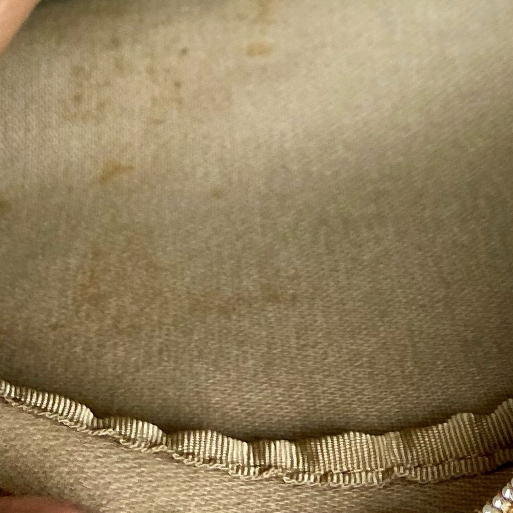 This is a pre-owned, amenity pouch made of colorful canvas and it comes with a dust bag. This pouch was converted to a shoulder or Crossbody Bag by adding a 40-inch gold chain. This size is good enough to fit a cell phone and wallet. It measures 9 inches long, 6 inches high and about 3 inches wide. It is in good condition with minimal wear as shown in photos.