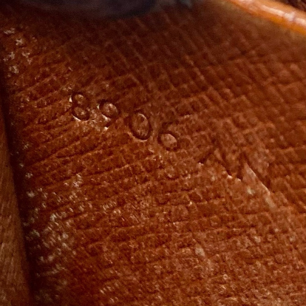 wallet made of monogram brown coated canvas with leather interior. This wallet has a slots for bills, IDs and Credit cards and a pocket for coins and keys. Folded it measures about 4.5 inches long and 4 inches wide. It has fading, discoloration, creases, edge wear repair on corners and folded areas as shown in photos. Date code on coin pocket as 8906AN- Made in France, 1989 June.