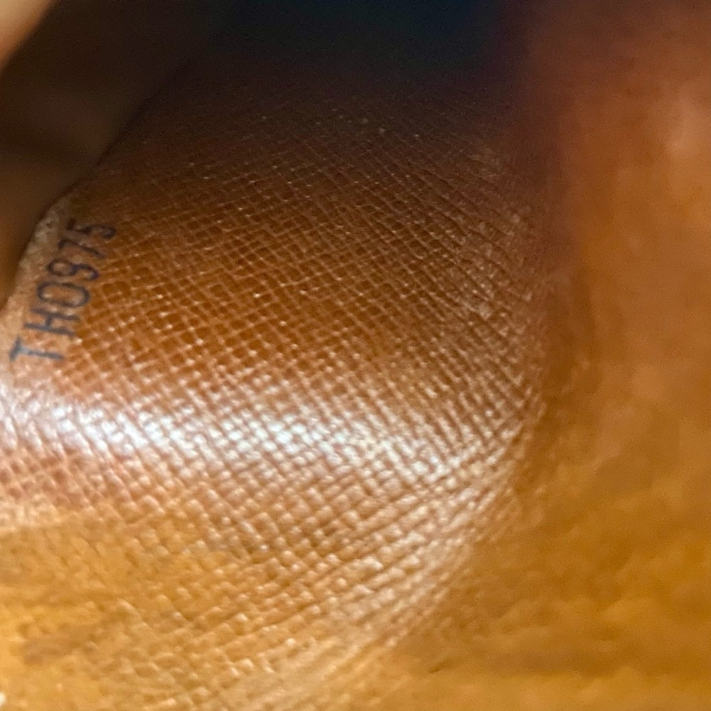 This is a rare, pre-owned tri-fold compact wallet made of brown monogrammed coated canvas. It has slots for paper bills, for credit cards and ID; pocket for coins and keys. Folded it measures about 4 inches long and 4 inches wide. It is in good condition as shown in photos. Date code shown TH0815 Made in France, January 1985.