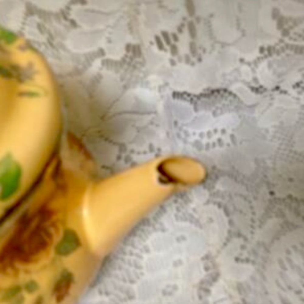 This is a beautiful, very good quality, 9-piece Tea Set, made of mustard yellow enamelware with floral design. The set includes the following:
