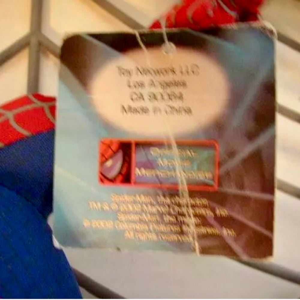This is an amazing, large Spiderman in web, made of fabric or soft material. Together it measures 21 inches high 18 inches long and 3 inches thick. Spiderman without the web measures 15 inches high and 12 inches wide. It is in very good condition with its original label as shown in photos. It is marked: Spiderman, the Character; ™ 2002 Marvel Characters; Spiderman the Movie; © 2002 Columbia Pictures Ind. Inc., All Rights Reserved; The label says: Spiderman Toy Network LLC; Los Angeles, CA, Made in China.