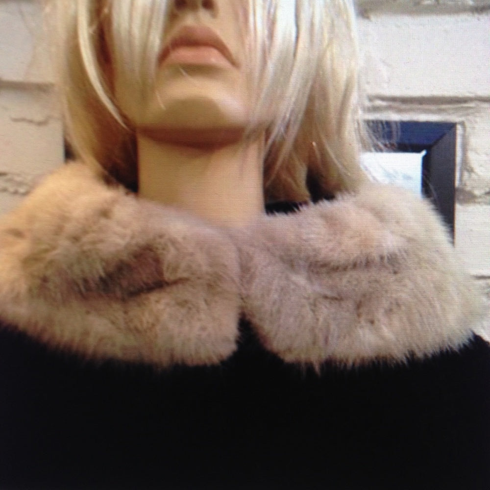 This dress coat is made of Genuine Mira Curl black Persian Lamb with grayish white fur collar and with 2 side pockets. It is in good condition as shown in photos. This will fit size 14 or Large. The actual measurements follows: