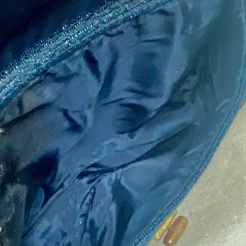 This is a beautiful crossbody bag made of navy blue hemp material and 48in- gold chain crossbody strap. It measures about 6 inches high, 10 inches long and 2 inches wide. It is in good condition with minimal wear as shown in photos. Please supersize photos for more detailed conditions.
