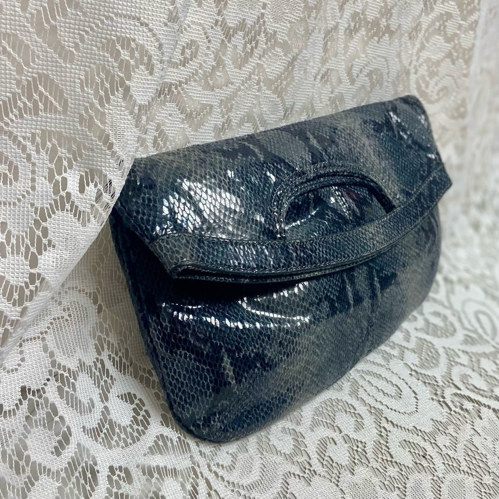 This is a beautiful bag made of good quality faux gray snakeskin leather and this can be used as a clutch if folded or a as a tote. It measures 13 inches long, 12 inches high and or 8 inches if folded as a clutch. It is in very good condition as shown in photos. Pictures are worth a thousand words so please super size photos for condition details.