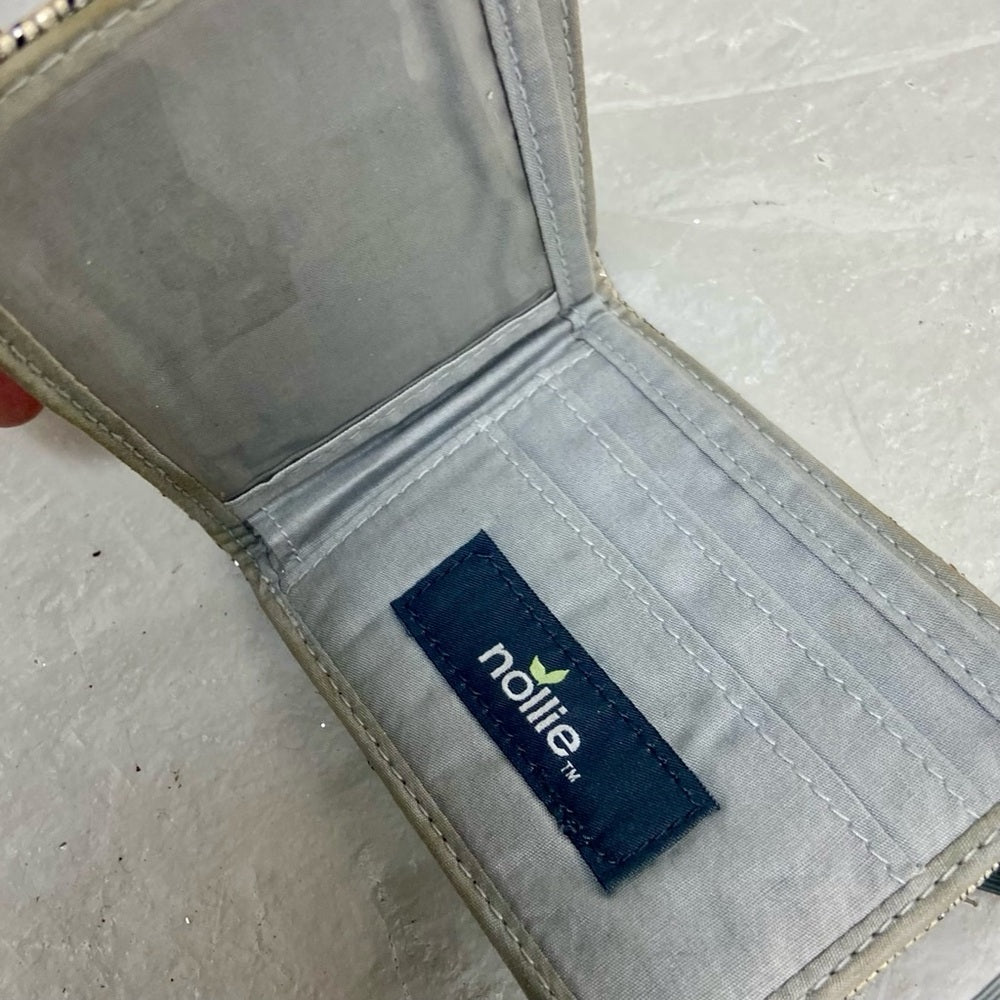This is a pre-owned compact wallet made of gray lace on the exterior. It measures 4 inches long and 3.5 inches wide. It is in good condition with minimal wear as shown in photos. Please supersize for condition details..