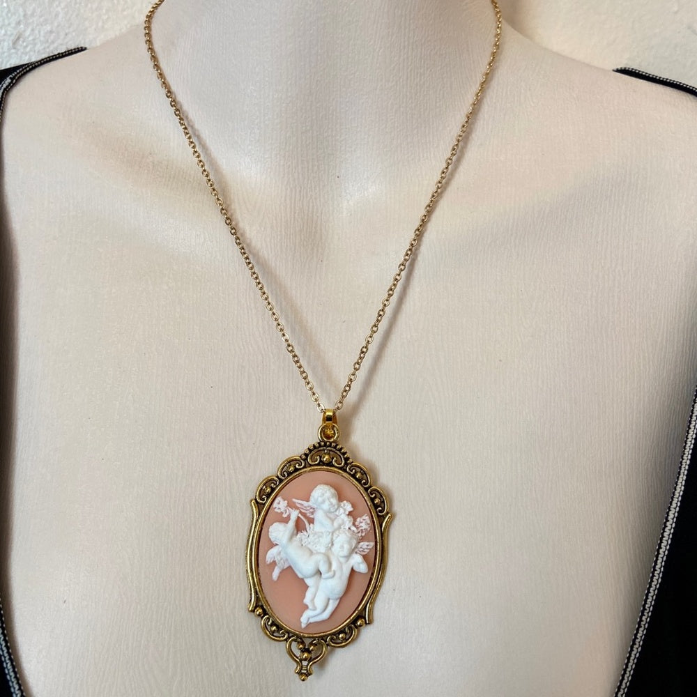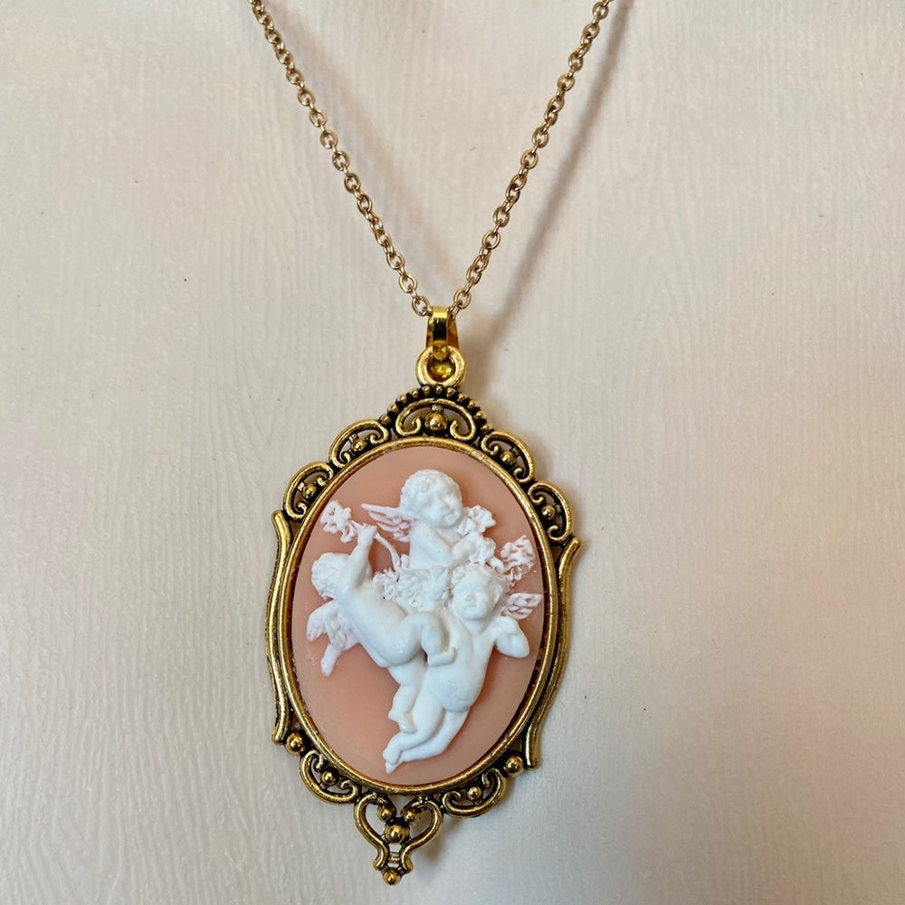 Vintage Pink Cameo of 3 Cherubs 18in Gold Plated Pendant Necklace