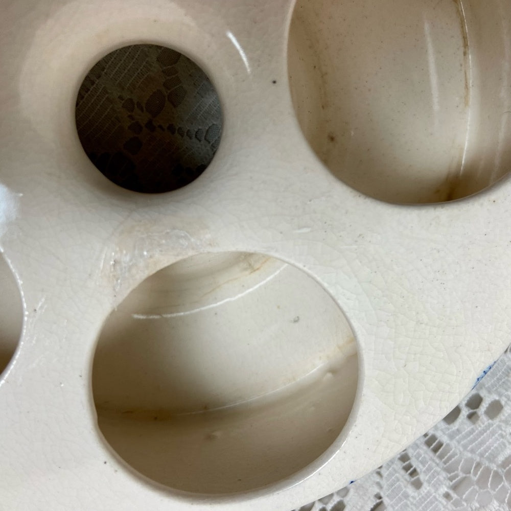Both cruets have original lids, although it has the usual staining; the mustard pot has the original spoon; comes with original base and wooden carrier. The ceramic base has a repaired chip as shown in one of the photos. Overall it is in good vintage condition with minimal wear or crazing, staining as shown in photos. Please supersize photos for condition details.
