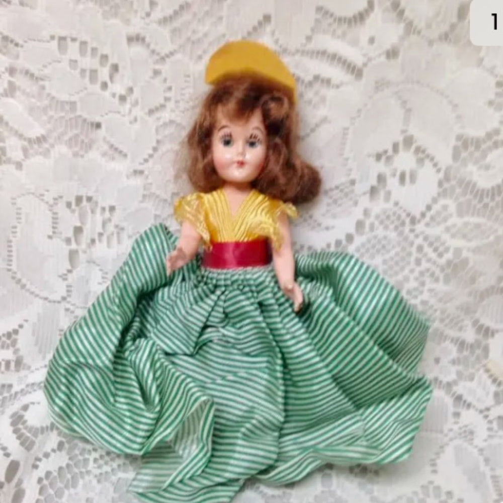 Vintage, Rare, 1950s 8in Plastic, Brunette Doll in Yellow and Green Dress