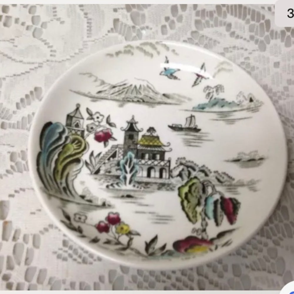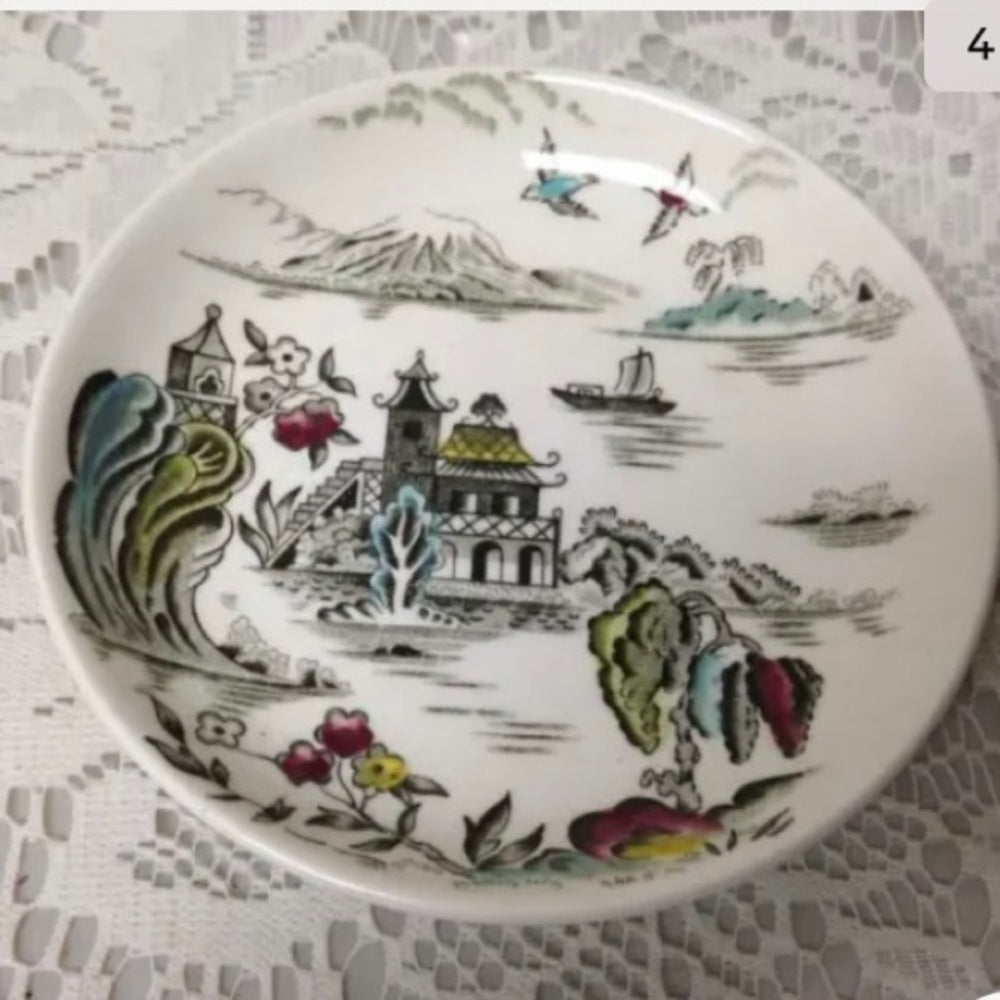 This is a beautiful set of butter pats with a variant gaudy willow pattern. It measures about 4 inches in diameter. It is in good condition with minimal wear as shown in photos. . It is marked: Myott Pagoda, Fine Staffordshire Ware, Made in England. Package weight is less than a pound.