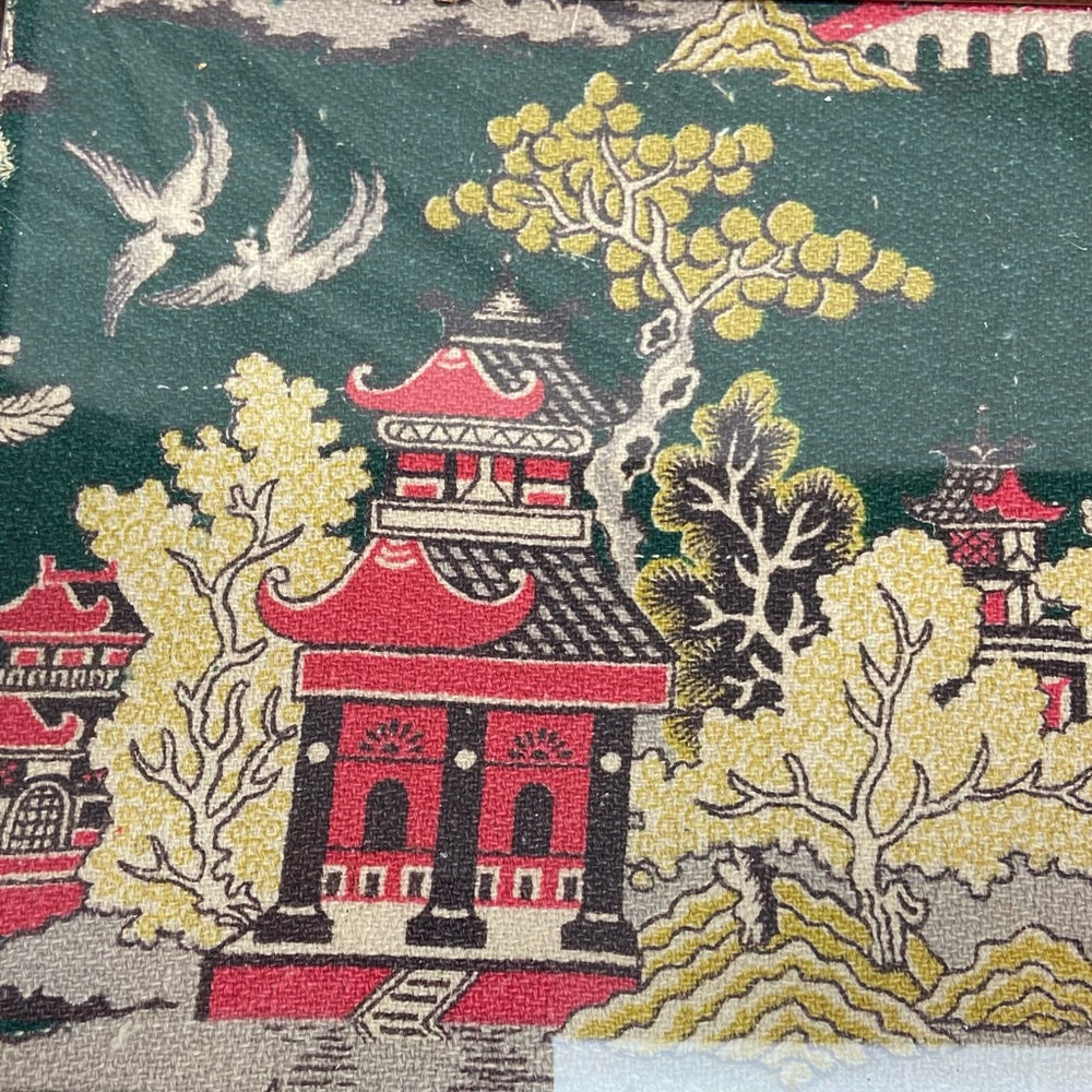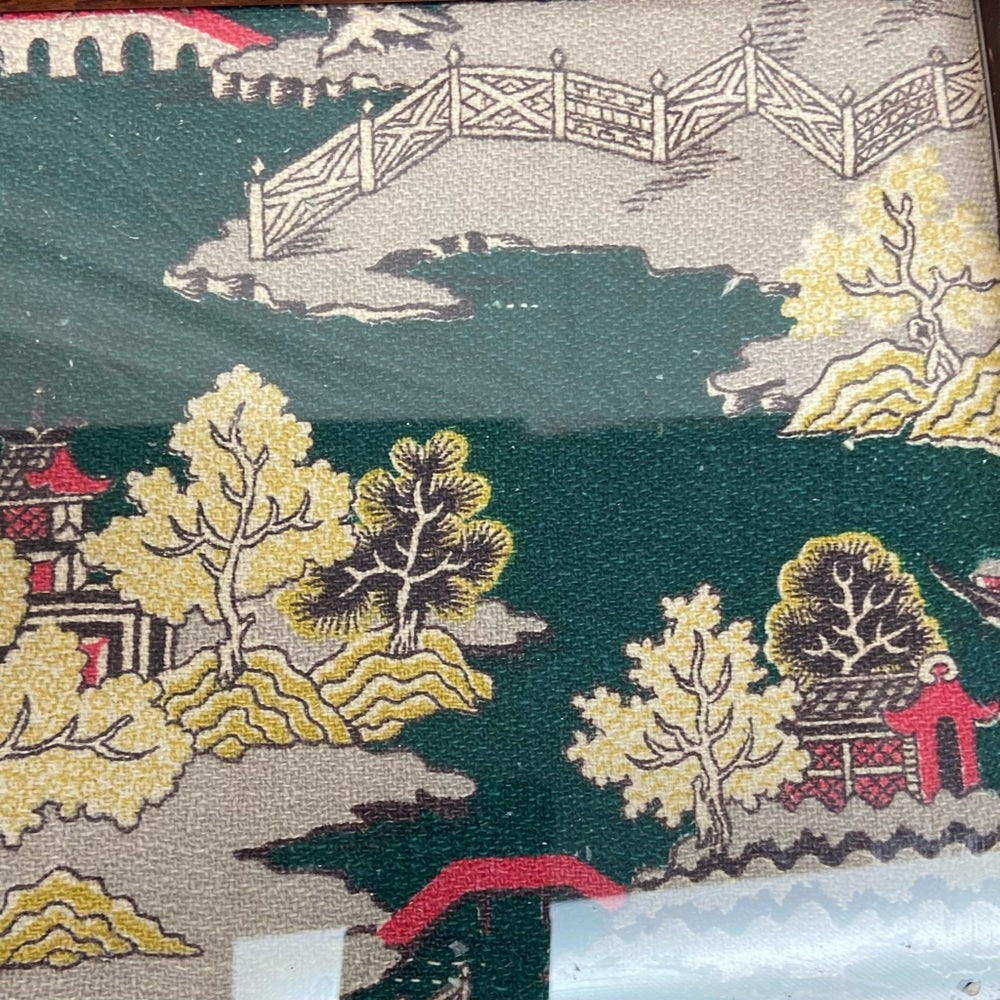 This is a beautiful polychrome Blue Willow, rectangular serving tray made of fabric decorated with the popular blue willow pattern in green colorful design, with wooden base and glass top. It measures 17.5 inches long, 12 inches wide and about 2.5 inches high. It is in good condition as shown in photos.
