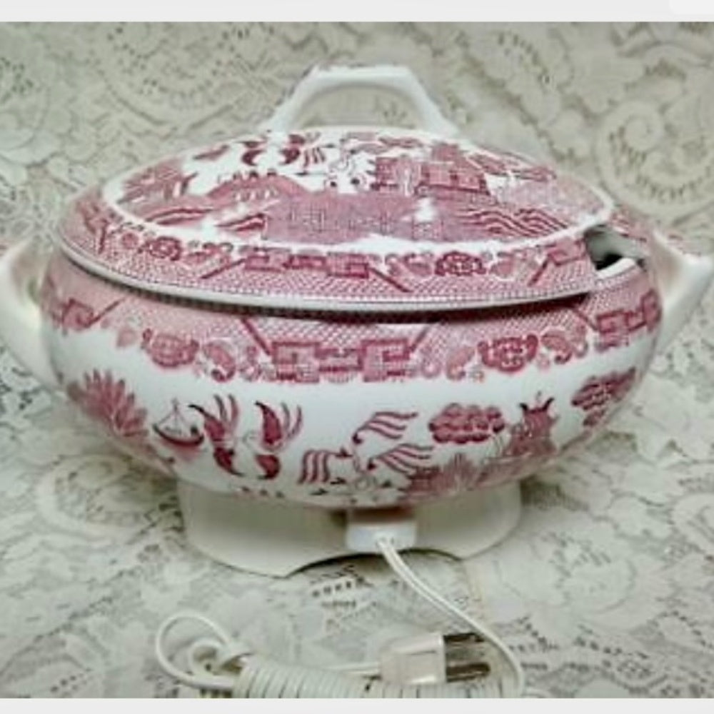 This is a beautiful, large, heavy, 2-pc soup bowl with lid decorated with a rare red willow pattern known. It measures about 8 inches tall with lid, 13 inches wide including handle and about 8 inches wide. This soup tureen is in very good vintage condition and comes with an electric cord as shown in photos. This rare, large soup bowl with lid and has a slot for soup ladle as well. There is a matching red ladle spoon shown in one of the photos and it is being sold separately in another listing. It is marked at the bottom: 120V 50W, Japan, Patent no. 714109. Package weight is about 6 lbs.