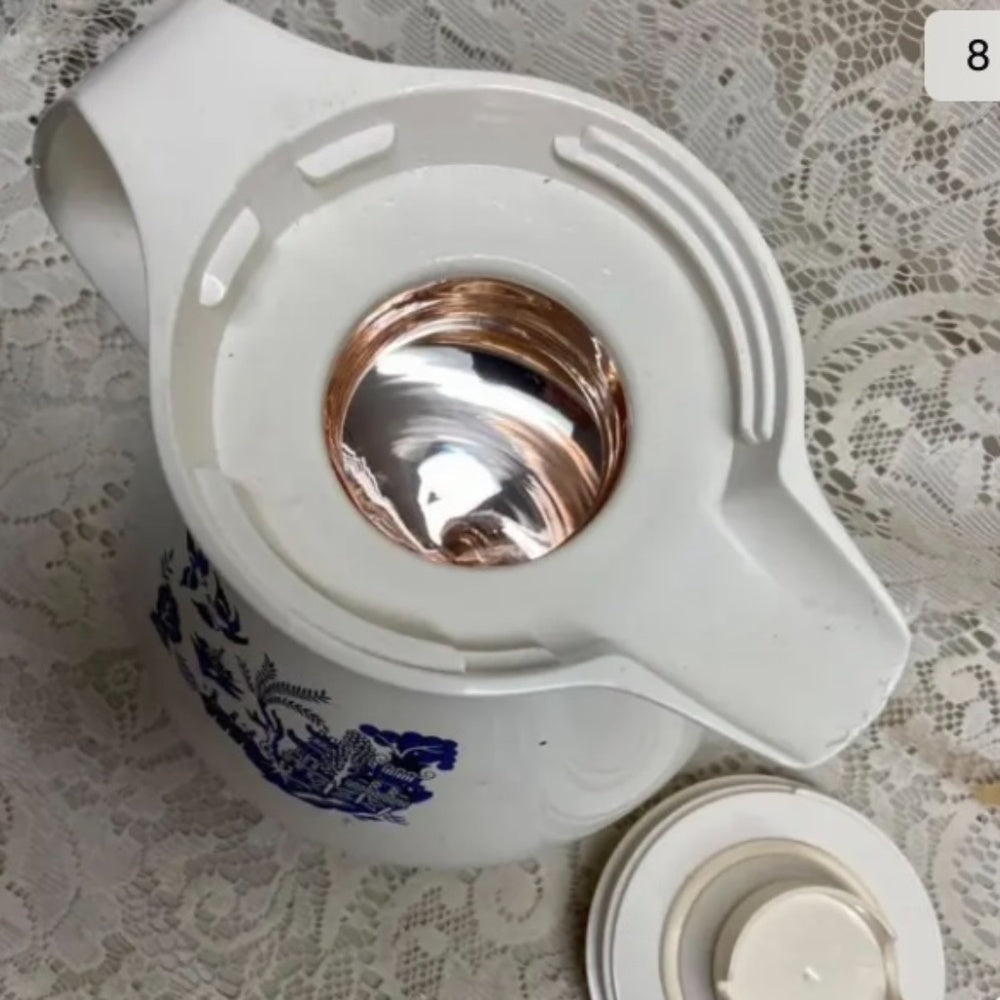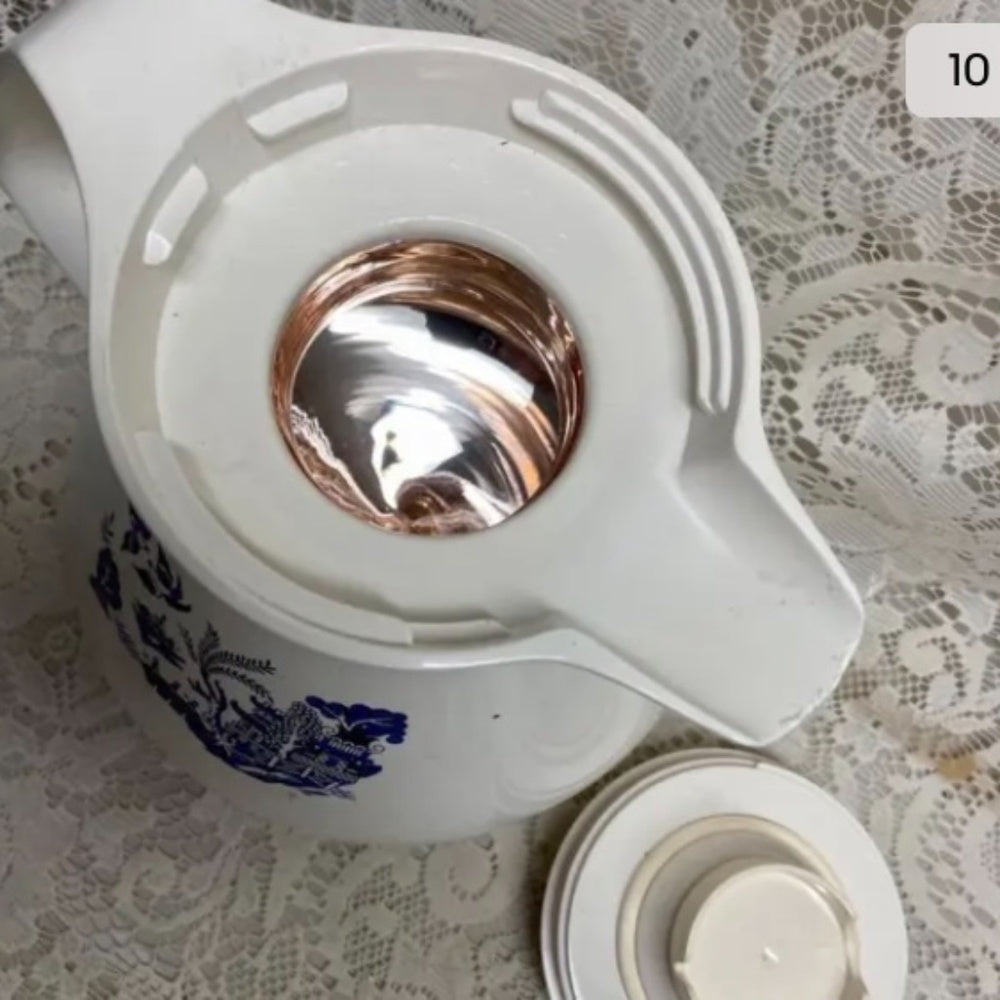 This is a beautifu white Teapot made of hard plastic and it is decorated with the popular blue willow patter. The blue willow design is not original and was added or handcrafted by a blue willow enthusiast. It measures about 8.5 inches high, 9 inches long and about 7.5 inches in diameter. It can accommodate 32-36 ounces of liquid. It is in good condition with minimal wear as shown in photos. It is marked: Thermos, Germany. Package weight is about 4 lbs.