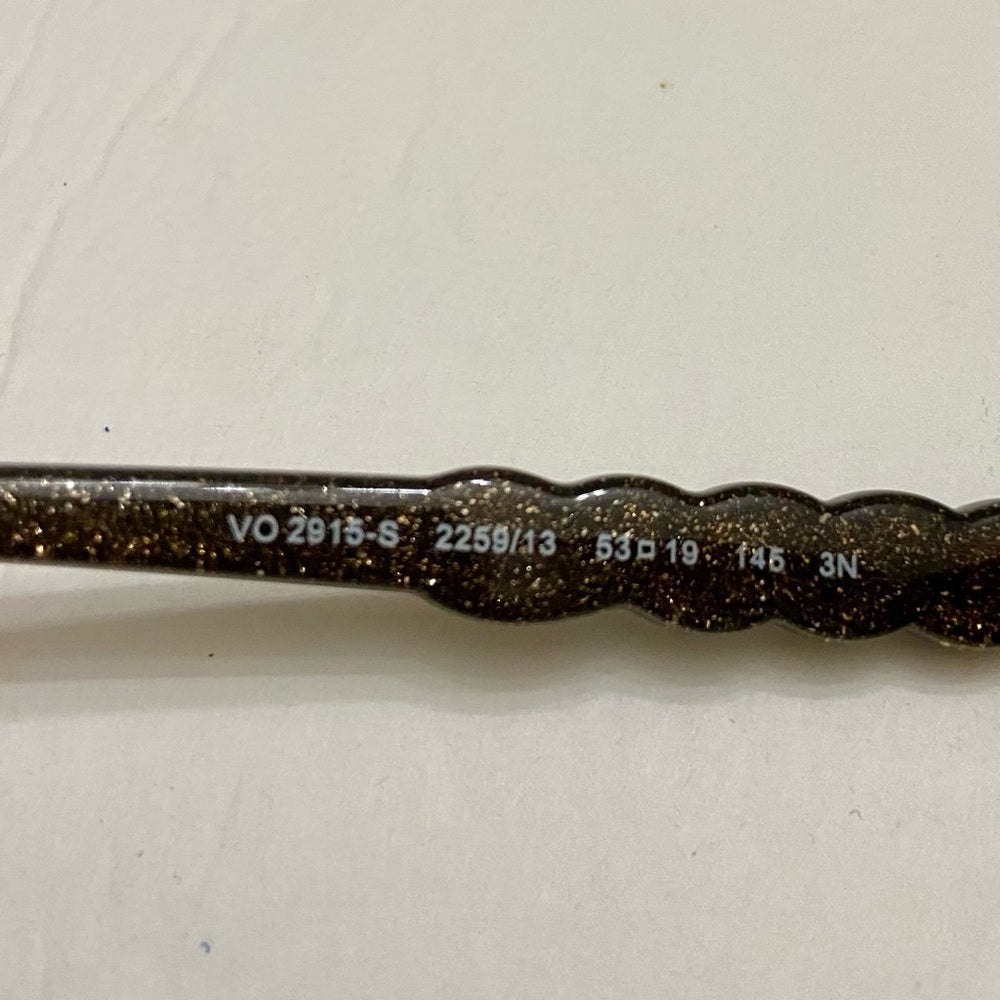 This is a beautiful brown sunglasses and it measures about 5.5 inches long and the lenses is about 2 inches high and 2.5 inches wide. Both temples have a braise design with some glitters. It has minimal scratches but overall is in good vintage condition as shown in photos. The temple has markings: VO2915/S 2259/13 53#19 145 2N.