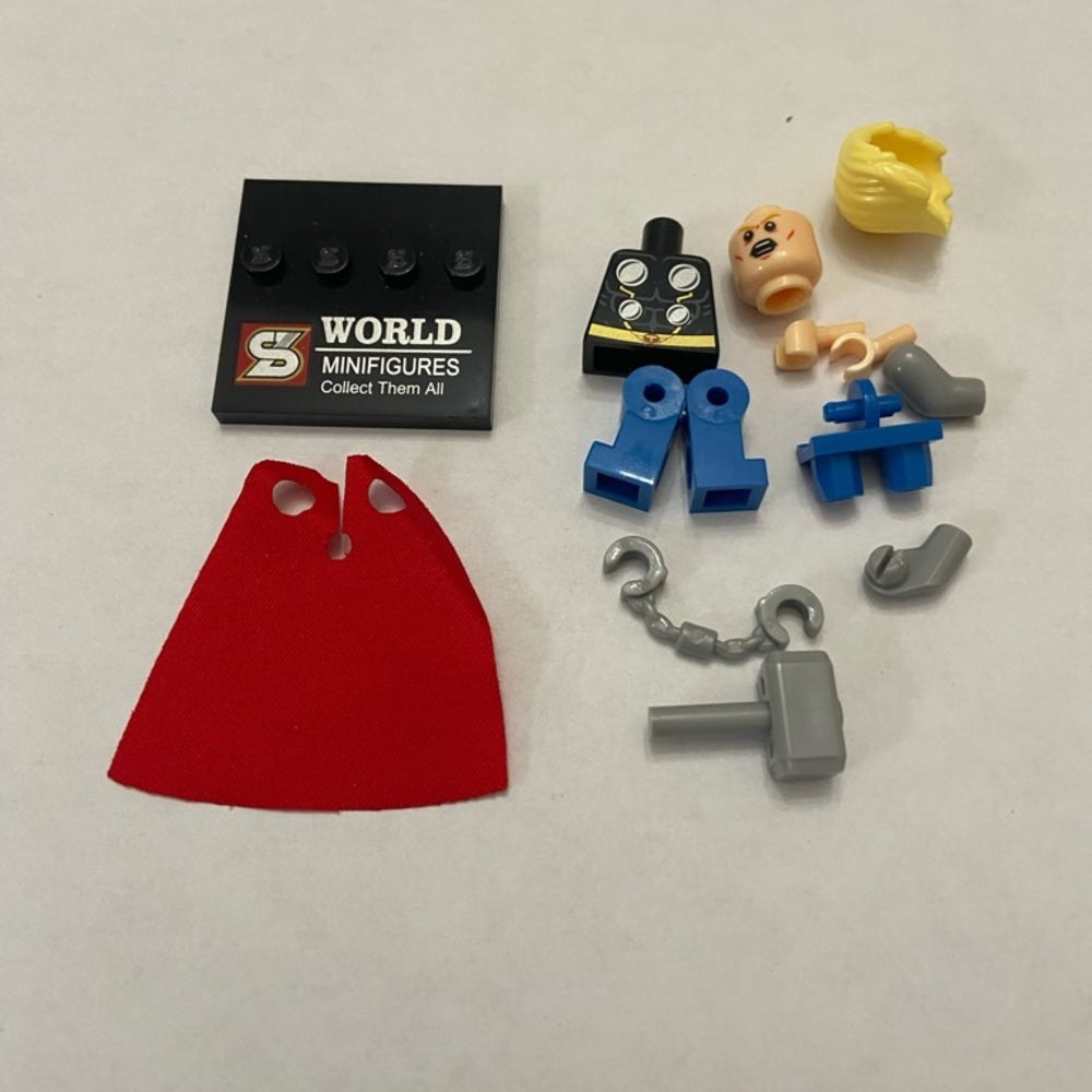 This is a rare Thor miniature figure consisting of about 12-14 small pieces. It is made of colorful plastic and he measures about 2 inches tall when put together. It is in very good condition as shown in photos. The stand is marked: World Mini Figures.
