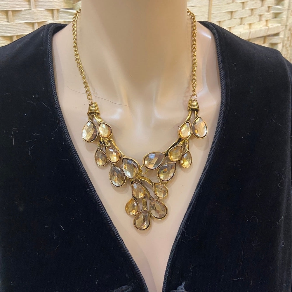 This is an elegant, cluster of yellow faux gemstones or Rhinestones and gold tone chain necklace. It is in good condition with minimal wear as shown in the photos above. The pendant measures 6" long and 2.75" wide, and the chain measures about 18-20" long. Please super size photos for condition details.